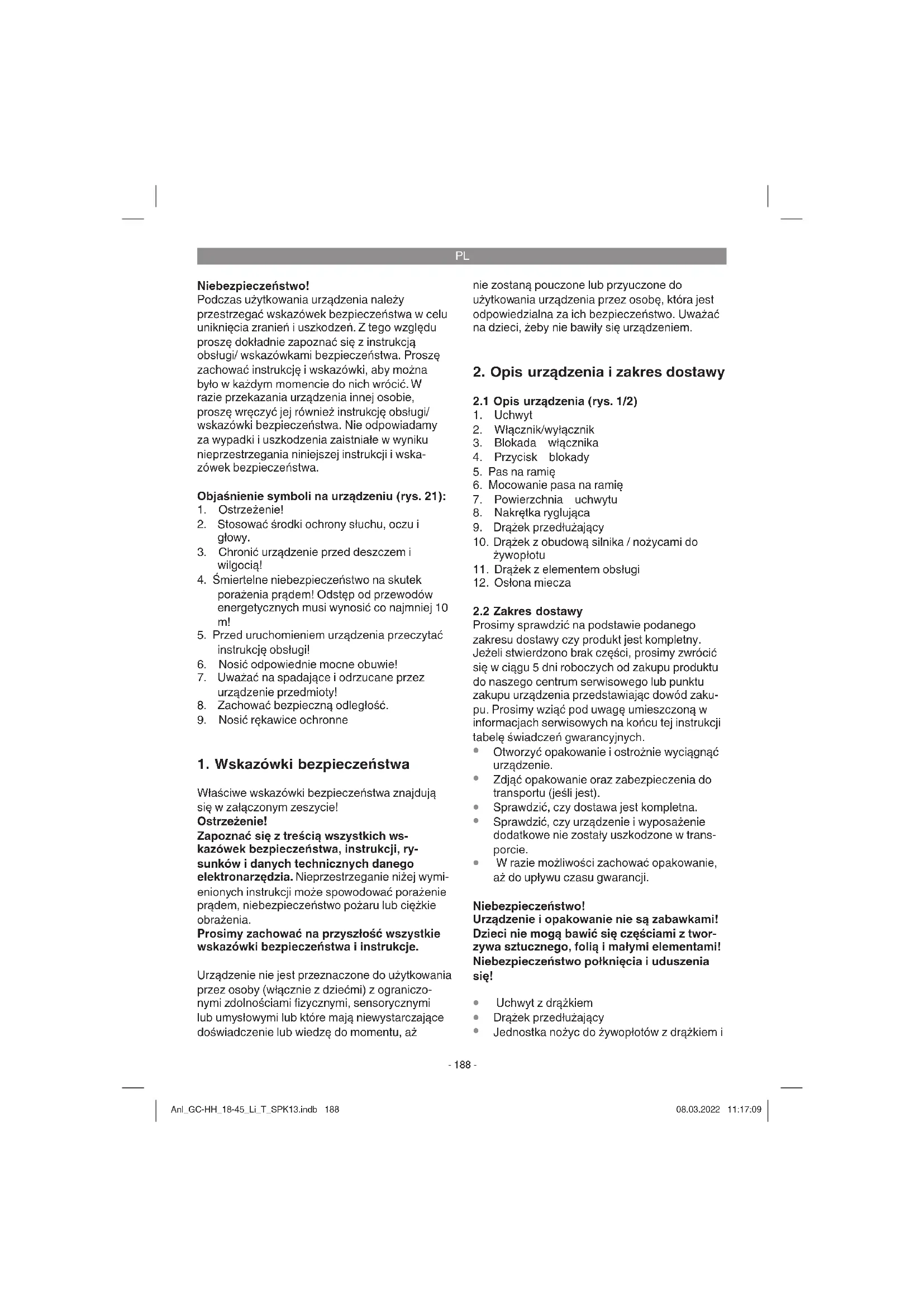 Sprzęt umieszczony jest w opakowaniu zapobiegającym uszkodzeniom w czasie trans- portu. Opakowanie jest surowcem i nadaje się do powtórnego użytku lub do recyklingu. Urządzenie oraz jego osprzęt składają się z rożnych rodzajów materiałów, jak np. metal i tworzywa sztuczne. Nie wyrzucać uszkodzonych urządzeń do śmietnika! W celu odpowiedniej utylizacji należy oddać urządzenie do specjalistycznego punktu zbiórki odpadów. Informacji o specjalistycznych punktach zbiórki odpadów udziela administracja komunalna. Anl_GC-HH_18-45_Li_T_SPK13.indb 192Anl_GC-HH_18-45_Li_T_SPK13.indb 192 08.03.2022 11:17:1008.03.2022 11:17:10PL