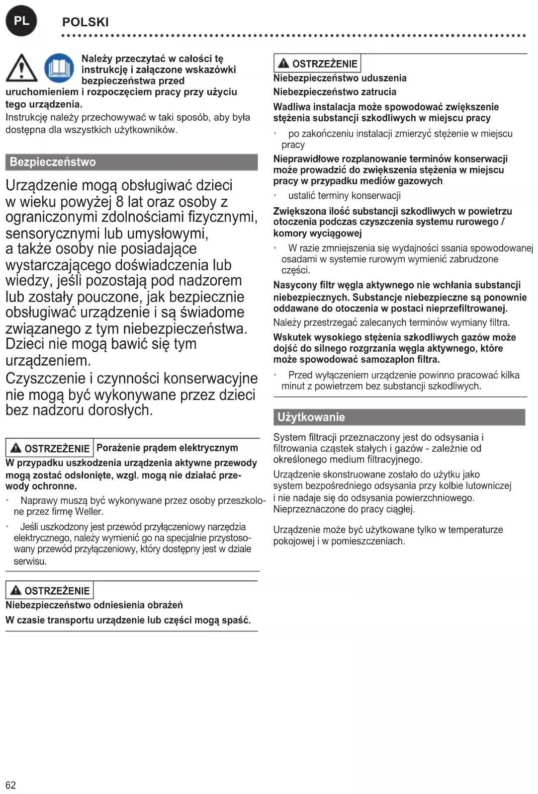 - Temperatura wrzenia molekuł gazu > 0 °C Doodsysaniaoparówklejeniastosowaćltr szerokopasmowy(bezltraHEPA). Pielęgnacja i konserwacja urządzenia OSTRZEENIE Przed rozpoczęciem jakichkolwiek pracy przy urządzeniu należy wyciągnąć wtyczkę z gniazdka. Osoba obsługująca musi z każdego miejsca, do którego ma dostęp, sprawdzić, że wtyk jest w dalszym ciągu wyjęty. Nie wolno wprowadzać żadnych zmian w urządzeniu! Naprawy muszą być wykonywane przez osoby przeszkolone przez rmę Weller. Stosować wyłącznie oryginalne części zamienne WELLER.