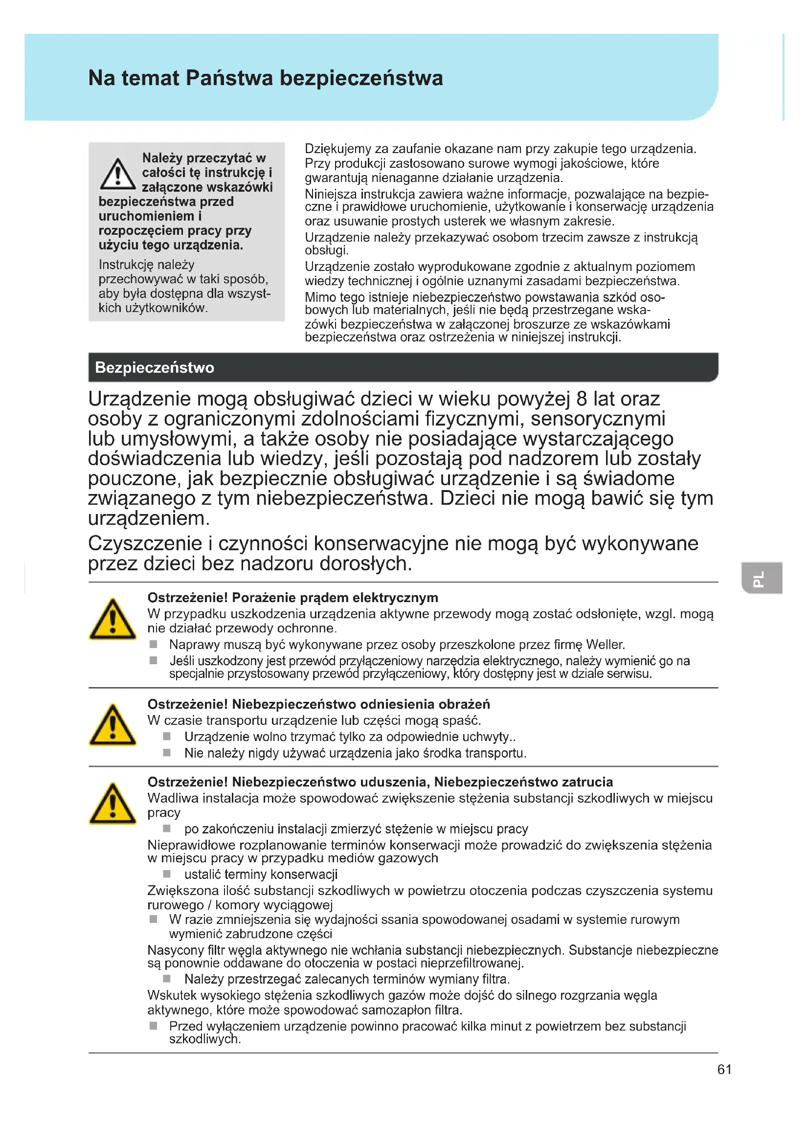 Dziękujemyzazaufanieokazanenamprzyzakupietegourządzenia. Przyprodukcjizastosowanosurowewymogijakościowe,które gwarantująnienagannedziałanieurządzenia. Niniejszainstrukcjazawieraważneinformacje,pozwalającenabezpie- czneiprawidłoweuruchomienie,użytkowanieikonserwacjęurządzenia orazusuwanieprostychusterekwewłasnymzakresie. Urządzenienależyprzekazywaćosobomtrzecimzawszezinstrukcją obsługi. Urządzeniezostałowyprodukowanezgodniezaktualnympoziomem wiedzytechnicznejiogólnieuznanymizasadamibezpieczeństwa. Mimotegoistniejeniebezpieczeństwopowstawaniaszkódoso- bowychlubmaterialnych,jeśliniebędąprzestrzeganewska- zówkibezpieczeństwawzałączonejbroszurzezewskazówkami bezpieczeństwaorazostrzeżeniawniniejszejinstrukcji. Na temat Państwa bezpieczeństwa Należy przeczytać w całości tę instrukcję i załączone wskazówki bezpieczeństwa przed uruchomieniem i rozpoczęciem pracy przy użyciu tego urządzenia. Instrukcjęnależy przechowywaćwtakisposób, abybyładostępnadlawszyst- kichużytkowników. Bezpieczeństwo Urządzeniemogąobsługiwaćdzieciwwiekupowyżej8latoraz osobyzograniczonymizdolnościamizycznymi,sensorycznymi lubumysłowymi,atakżeosobynieposiadającewystarczającego doświadczenialubwiedzy,jeślipozostająpodnadzoremlubzostały pouczone,jakbezpiecznieobsługiwaćurządzenieisąświadome związanegoztymniebezpieczeństwa.Dzieciniemogąbawićsiętym urządzeniem. Czyszczenieiczynnościkonserwacyjneniemogąbyćwykonywane przezdziecibeznadzorudorosłych. Ostrzeżenie! Porażenie prądem elektrycznym Wprzypadkuuszkodzeniaurządzeniaaktywneprzewodymogązostaćodsłonięte,wzgl.mogą niedziałaćprzewodyochronne. NaprawymusząbyćwykonywaneprzezosobyprzeszkoloneprzezrmęWeller. Jeśliuszkodzonyjestprzewódprzyłączeniowynarzędziaelektrycznego,należywymienićgona specjalnieprzystosowanyprzewódprzyłączeniowy,którydostępnyjestwdzialeserwisu. Ostrzeżenie! Niebezpieczeństwo odniesienia obrażeń Wczasietransportuurządzenielubczęścimogąspaść. Urządzeniewolnotrzymaćtylkozaodpowiednieuchwyty.. Nienależynigdyużywaćurządzeniajakośrodkatransportu. Ostrzeżenie! Niebezpieczeństwo uduszenia, Niebezpieczeństwo zatrucia Wadliwainstalacjamożespowodowaćzwiększeniestężeniasubstancjiszkodliwychwmiejscu pracy pozakończeniuinstalacjizmierzyćstężeniewmiejscupracy Nieprawidłowerozplanowanieterminówkonserwacjimożeprowadzićdozwiększeniastężenia wmiejscupracywprzypadkumediówgazowych ustalićterminykonserwacji Zwiększonailośćsubstancjiszkodliwychwpowietrzuotoczeniapodczasczyszczeniasystemu rurowego/komorywyciągowej Wraziezmniejszeniasięwydajnościssaniaspowodowanejosadamiwsystemierurowym wymienićzabrudzoneczęści Nasyconyltrwęglaaktywnegoniewchłaniasubstancjiniebezpiecznych. Substancje niebezpieczne sąponownieoddawanedootoczeniawpostacinieprzeltrowanej. Należyprzestrzegaćzalecanychterminówwymianyltra. Wskutekwysokiegostężeniaszkodliwychgazówmożedojśćdosilnegorozgrzaniawęgla aktywnego,któremożespowodowaćsamozapłonltra. Przedwyłączeniemurządzeniepowinnopracowaćkilkaminutzpowietrzembezsubstancji szkodliwych.62