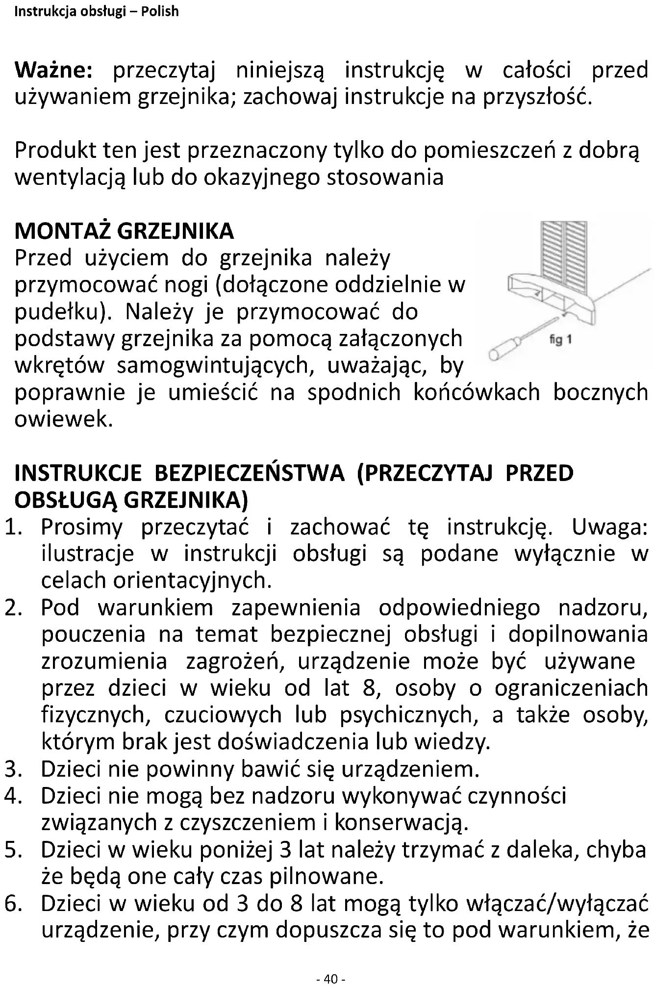 Voldoet aan de eisen van de Richtlijnen van de raad: VERORDENING (EU) Nr. 2015/1188 VAN DE COMMISSIE van 28 april 2015 en VERORDENING TOT WIJZIGING (EU) 2016/2282 VAN DE COMMISSIE ter uitvoering van Richtlijn 2009/125/EU van het Europees Parlement en de Raad betreffende de eisen inzake het ecologisch ontwerp voor toestellen voor lokale ruimteverwarming Voor informatie voor de consument over de installatie, de werking en het onderhoud van het product en de AEEA-informatie, raadpleeg de gebruiksaanwijzing die zich in de verpakking bevindt.- 40 - Instrukcja obsługi – Polish Ważne: przeczytaj niniejszą instrukcję w całości przed używaniem grzejnika; zachowaj instrukcje na przyszłość. Produkt ten jest przeznaczony tylko do pomieszczeń z dobrą wentylacją lub do okazyjnego stosowania MONTAŻ GRZEJNIKA Przed użyciem do grzejnika należy przymocować nogi (dołączone oddzielnie w pudełku). Należy je przymocować do podstawy grzejnika za pomocą załączonych wkrętów samogwintujących, uważając, by poprawnie je umieścić na spodnich końcówkach bocznych owiewek.