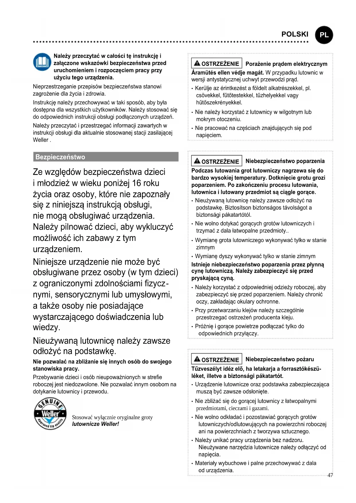 ČESKÝ47 Należy przeczytać w całości tę instrukcję i załączone wskazówki bezpieczeństwa przed uruchomieniem i rozpoczęciem pracy przy użyciu tego urządzenia. Nieprzestrzeganie przepisów bezpieczeństwa stanowi zagrożenie dla życia i zdrowia. Instrukcję należy przechowywać w taki sposób, aby była dostępna dla wszystkich użytkowników. Należy stosować się do odpowiednich instrukcji obsługi podłączonych urządzeń. Należy przeczytać i przestrzegać informacji zawartych w instrukcji obsługi dla aktualnie stosowanej stacji zasilającej Weller . Bezpieczeństwo Ze względów bezpieczeństwa dzieci i młodzież w wieku poniżej 16 roku życia oraz osoby, które nie zapoznały się z niniejszą instrukcją obsługi, nie mogą obsługiwać urządzenia. Należy pilnować dzieci, aby wykluczyć możliwość ich zabawy z tym urządzeniem. Niniejsze urządzenie nie może być obsługiwane przez osoby (w tym dzieci) z ograniczonymi zdolnościami zycz