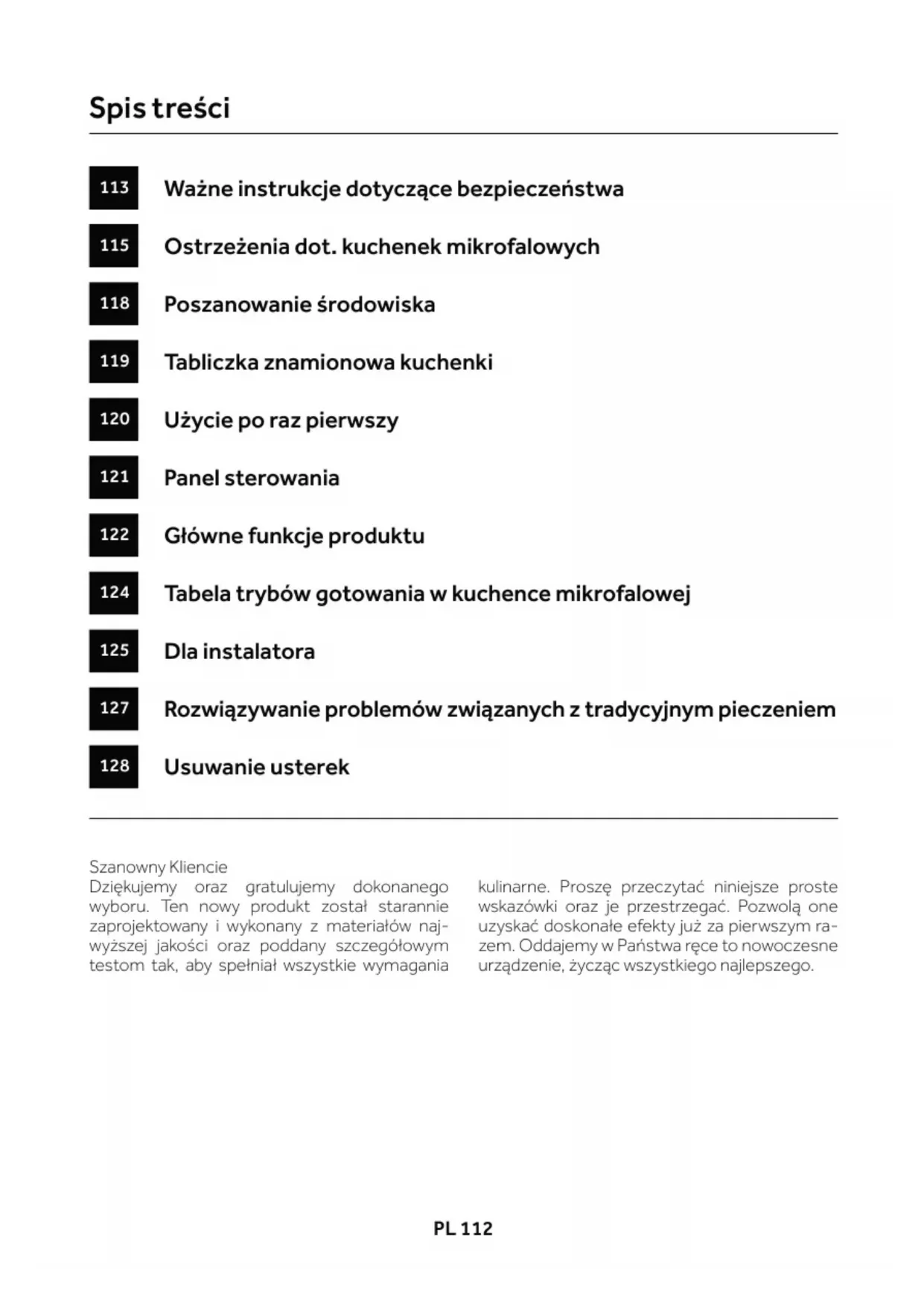 - Używaj wyłącznie naczyń przeznaczonych do kuchenek mikrofalo- wych.PL 112 PL 113 Szanowny Kliencie Dziękujemy oraz gratulujemy dokonanego wyboru. Ten nowy produkt został starannie zaprojektowany i wykonany z materiałów naj- wyższej jakości oraz poddany szczegółowym testom tak, aby spełniał wszystkie wymagania kulinarne. Proszę przeczytać niniejsze proste wskazówki oraz je przestrzegać. Pozwolą one uzyskać doskonałe efekty już za pierwszym ra- zem. Oddajemy w Państwa ręce to nowoczesne urządzenie, życząc wszystkiego najlepszego. Ważne instrukcje dotyczące bezpieczeństwa Ostrzeżenia dot. kuchenek mikrofalowych Poszanowanie środowiska Tabliczka znamionowa kuchenki Użycie po raz pierwszy Panel sterowania Główne funkcje produktu Tabela trybów gotowania w kuchence mikrofalowej Dla instalatora Rozwiązywanie problemów związanych z tradycyjnym pieczeniem Usuwanie usterek