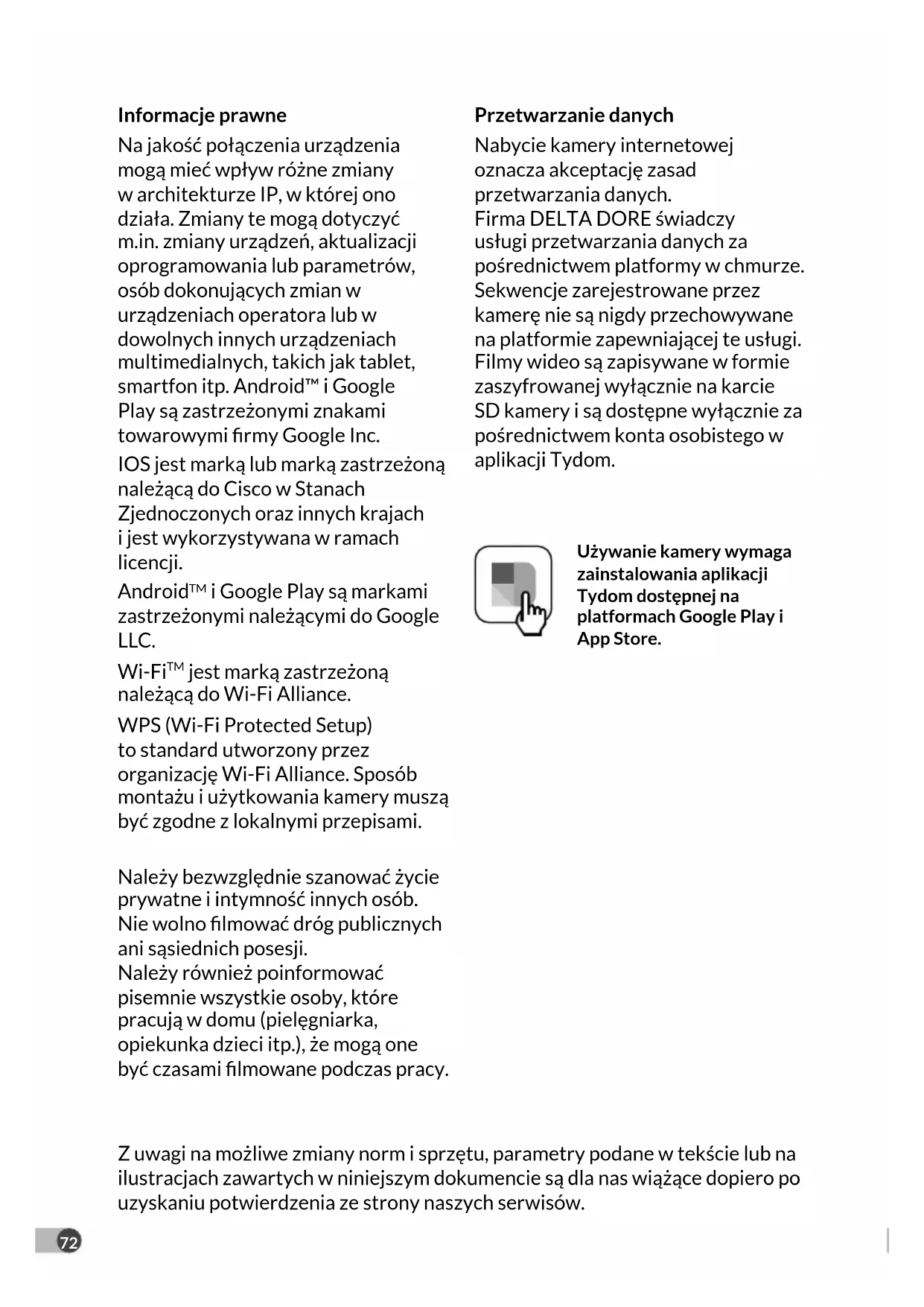 jest marką zastrzeżoną należącą do Wi-Fi Alliance. WPS (Wi-Fi Protected Setup) to standard utworzony przez organizację Wi-Fi Alliance. Sposób montażu i użytkowania kamery muszą być zgodne z lokalnymi przepisami. Należy bezwzględnie szanować życie prywatne i intymność innych osób. Nie wolno lmować dróg publicznych ani sąsiednich posesji. Należy również poinformować pisemnie wszystkie osoby, które pracują w domu (pielęgniarka, opiekunka dzieci itp.), że mogą one być czasami lmowane podczas pracy. Przetwarzanie danych Nabycie kamery internetowej oznacza akceptację zasad przetwarzania danych. Firma DELTA DORE świadczy usługi przetwarzania danych za pośrednictwem platformy w chmurze. Sekwencje zarejestrowane przez kamerę nie są nigdy przechowywane na platformie zapewniającej te usługi. Filmy wideo są zapisywane w formie zaszyfrowanej wyłącznie na karcie SD kamery i są dostępne wyłącznie za pośrednictwem konta osobistego w aplikacji Tydom. Używanie kamery wymaga zainstalowania aplikacji Tydom dostępnej na platformach Google Play i App Store. Z uwagi na możliwe zmiany norm i sprzętu, parametry podane w tekście lub na ilustracjach zawartych w niniejszym dokumencie są dla nas wiążące dopiero po uzyskaniu potwierdzenia ze strony naszych serwisów.73