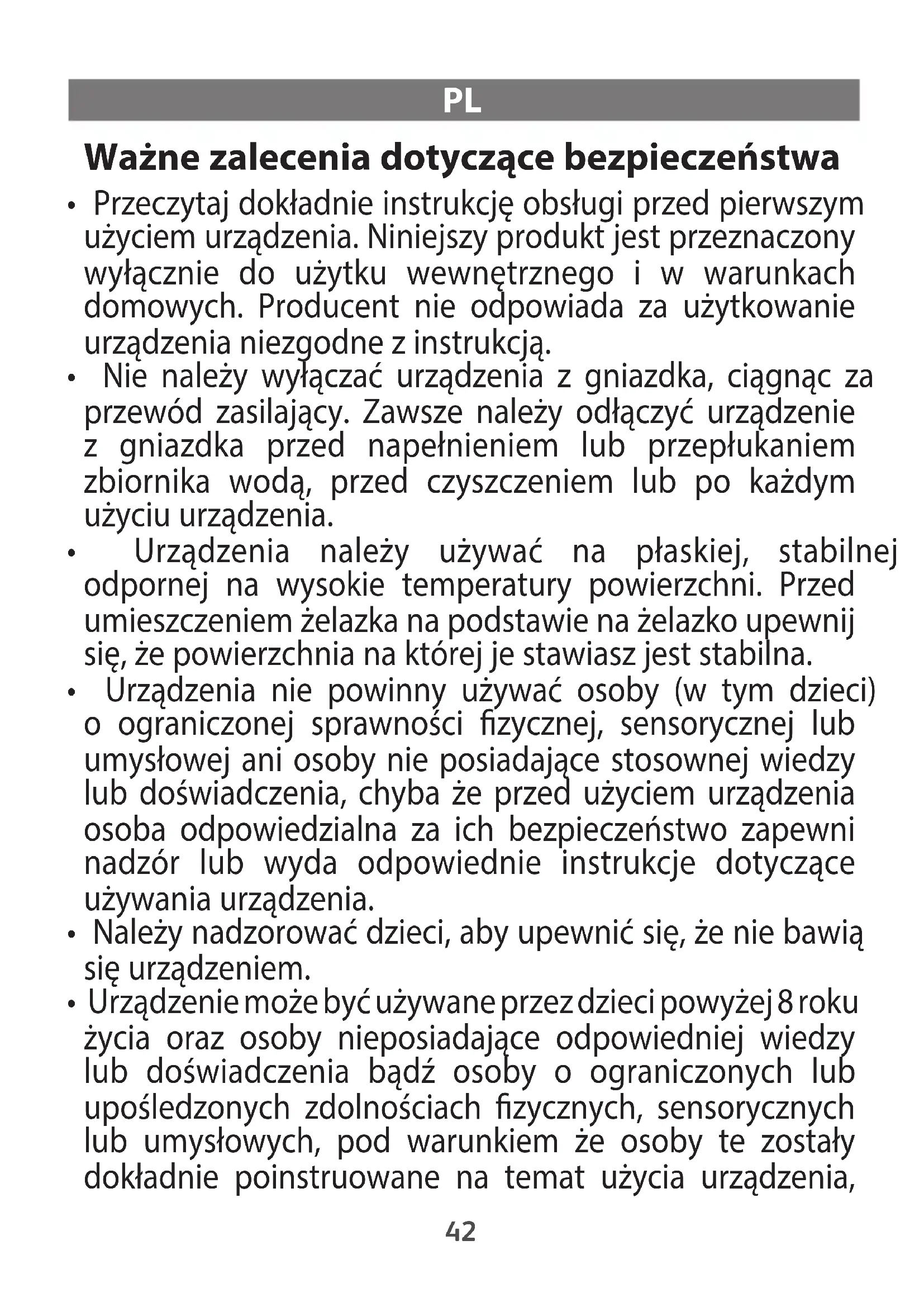 - Urządzenie może być używane przez dzieci powyżej 8 roku życia oraz osoby nieposiadające odpowiedniej wiedzy lub doświadczenia bądź osoby o ograniczonych lub upośledzonych zdolnościach zycznych, sensorycznych lub umysłowych, pod warunkiem że osoby te zostały dokładnie poinstruowane na temat użycia urządzenia, 42są nadzorowane i świadome zagrożeń związanych z jego użytkowaniem.