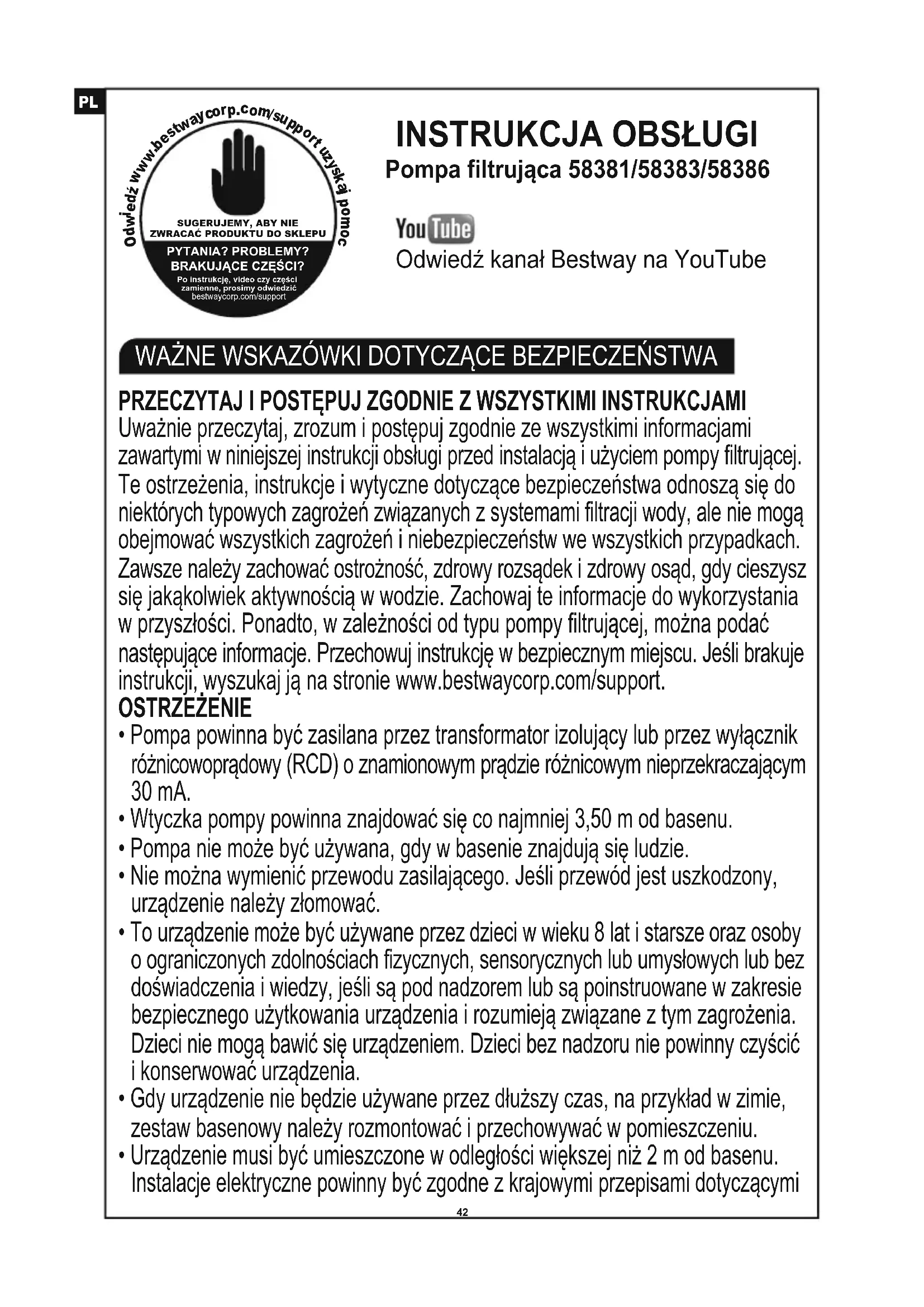 - Firma Bestway nie ponosi odpowiedzialności za jakiekolwiek uszkodzenia pompy filtrującej spowodowane niewłaściwą obsługą lub nieprzestrzeganiem tych instrukcji.