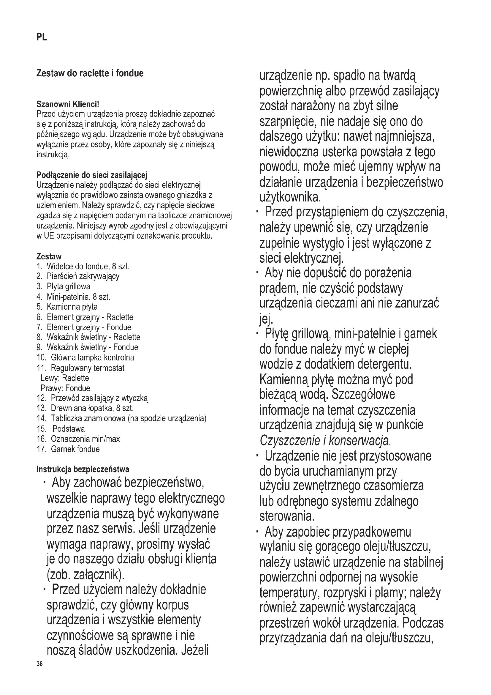 Instrukcja bezpieczeństwa ∙ Aby zachować bezpieczeństwo, wszelkie naprawy tego elektrycznego urządzenia muszą być wykonywane przez nasz serwis. Jeśli urządzenie wymaga naprawy, prosimy wysłać je do naszego działu obsługi klienta (zob. załącznik). ∙ Przed użyciem należy dokładnie sprawdzić, czy główny korpus urządzenia i wszystkie elementy czynnościowe są sprawne i nie noszą śladów uszkodzenia. Jeżeli urządzenie np. spadło na twardą powierzchnię albo przewód zasilający został narażony na zbyt silne szarpnięcie, nie nadaje się ono do dalszego użytku: nawet najmniejsza, niewidoczna usterka powstała z tego powodu, może mieć ujemny wpływ na działanie urządzenia i bezpieczeństwo użytkownika. ∙ Przed przystąpieniem do czyszczenia, należy upewnić się, czy urządzenie zupełnie wystygło i jest wyłączone z sieci elektrycznej. ∙ Aby nie dopuścić do porażenia prądem, nie czyścić podstawy urządzenia cieczami ani nie zanurzać jej. ∙ Płytę grillową, mini-patelnie i garnek do fondue należy myć w ciepłej wodzie z dodatkiem detergentu. Kamienną płytę można myć pod bieżącą wodą. Szczegółowe informacje na temat czyszczenia urządzenia znajdują się w punkcie Czyszczenie i konserwacja. ∙ Urządzenie nie jest przystosowane do bycia uruchamianym przy użyciu zewnętrznego czasomierza lub odrębnego systemu zdalnego sterowania. ∙ Aby zapobiec przypadkowemu wylaniu się gorącego oleju/tłuszczu, należy ustawić urządzenie na stabilnej powierzchni odpornej na wysokie temperatury, rozpryski i plamy; należy również zapewnić wystarczającą przestrzeń wokół urządzenia. Podczas przyrządzania dań na oleju/tłuszczu, PL37 142 x 208 mm uniknięcie rozprysków nie zawsze jest możliwe. ∙ Nie stawiać urządzenia w rogu ani nie opierać go o ścianę. Upewnić się, czy w pobliżu nie znajdują się żadne materiały łatwopalne. ∙ Urządzenie przeznaczone jest do zastosowań domowych lub podobnych, jak np. w - kuchniach biurowych lub innych miejscach pracy; - agroturystyce; - hotelach, motelach itp. oraz innych podobnych lokalach (przez klientów); - pensjonatach. ∙ Nie dopuszczać do używania urządzenia przez dzieci w wieku poniżej 8 lat. ∙ Dzieci w wieku 8 lub więcej lat mogą obsługiwać urządzenie wyłącznie pod stałym nadzorem. ∙ Osoby o ograniczonych zdolnościach zycznych, czuciowych lub psychicznych albo nieposiadające stosownego doświadczenia lub wiedzy, mogą korzystać z urządzenia tylko wówczas, kiedy znajdują się pod nadzorem lub zostały poinstruowane, jak używać urządzenia i są w pełni świadome wszelkich zagrożeń i wymaganych środków ostrożności. ∙ Nie dopuszczać do używania urządzenia jako zabawki przez dzieci. ∙ Nie wolno pozwalać dzieciom na wykonywanie jakichkolwiek prac związanych bezpośrednio z konserwacją lub czyszczeniem urządzenia. ∙ Nie dopuszczać do urządzenia i jego przewodu zasilającego dzieci poniżej 8 lat. ∙ Ostrzeżenie: Nie pozwalać, aby dzieci miały dostęp do elementów opakowania, ponieważ mogą one spowodować zagrożenie, np. uduszenia. ∙ Powierzchnie urządzenia oraz akcesoria stają się gorące podczas pracy urządzenia i utrzymują temperaturę przez jakiś czas po jej zakończeniu. Ostrzeżenie: Dotknięcie grozi oparzeniem. ∙ Urządzenie można włączyć tylko wówczas, kiedy płyta grillowa jest prawidłowo zamontowana, a na niej umieszczona jest albo kamienna płyta albo garnek do fondue. ∙ Do grillowania oraz przyrządzania fondue nie należy wykorzystywać zamrożonych produktów – trzeba je najpierw rozmrozić i w razie potrzeby osuszyć. ∙ Na płycie kamiennej nie należy umieszczać zamrożonej żywności ani produktów zawierających cukier (jak np. korniszony czy musztarda). ∙ Płyta kamienna wykonana jest z naturalnego materiału. Niewielkie pęknięcia wynikające z naturalnego rozkurczania i skurczania się płyty podczas ogrzewania i stygnięcia urządzenia są zjawiskiem normalnym, podobnie jak zmiana barwy na ciemniejszą. Nie ma to negatywnego wpływu na pracę urządzenia. ∙ Aby nie uszkodzić warstwy ochronnej płyty grillowej oraz mini-patelni, używać wyłącznie takich przyborów, które nie porysują powierzchni. ∙ Przegrzany olej/tłuszcz może się zapalić. W takim wypadku należy wyjąć wtyczkę z sieci, a garnek nakryć niepalną pokrywą aby zadusić płomienie. ∙ Nigdy nie należy próbować gasić płonącego oleju/ tłuszczu wodą. Nie należy również do gorącego oleju/tłuszczu wlewać wody. ∙ Ostrzeżenie: Nigdy nie należy przenosić rozgrzanego urządzenia, na przykład podczas używania lub bezpośrednio po zakończeniu czynności smażenia (można się potknąć i spowodować wypadek). Należy zawsze postępować z niezwykłą ostrożnością: gorący tłuszcz powoduje poważne oparzenia. ∙ Garnek fondue można tylko używać z podstawą z zestawu. ∙ Wtyczkę należy wyjąć z gniazda elektrycznego: - po zakończeniu pracy; - w przypadku stwierdzenia usterki urządzenia; - zanim urządzenie zostanie pozostawione bez nadzoru; - i przed przystąpieniem do czyszczenia. ∙ Wyjmując wtyczkę z gniazdka nigdy nie należy szarpać za przewód. ∙ Za szkody wynikłe z nieprawidłowego używania sprzętu lub użytkowania niezgodnego z instrukcją obsługi winę ponosi wyłącznie użytkownik.38 142 x 208 mm Instrukcja używania grilla Przed pierwszym użyciem ∙ Zdjąć z urządzenia wszystkie elementy opakowania i naklejki. ∙ Przed pierwszym użyciem urządzenia, wyczyścić poszczególne elementy wilgotną ściereczką. ∙ Rozgrzać urządzenie z włożonymi mini-patelniami, płytą grillową i płytą kamienną na około 10 minut bez żywności w celu pozbycia się specycznego zapachu, jaki pojawia się przy pierwszym włączeniu grilla (może się też pojawić nieco dymu). Z tego względu należy zapewnić w pomieszczeniu odpowiednią wentylację, 
