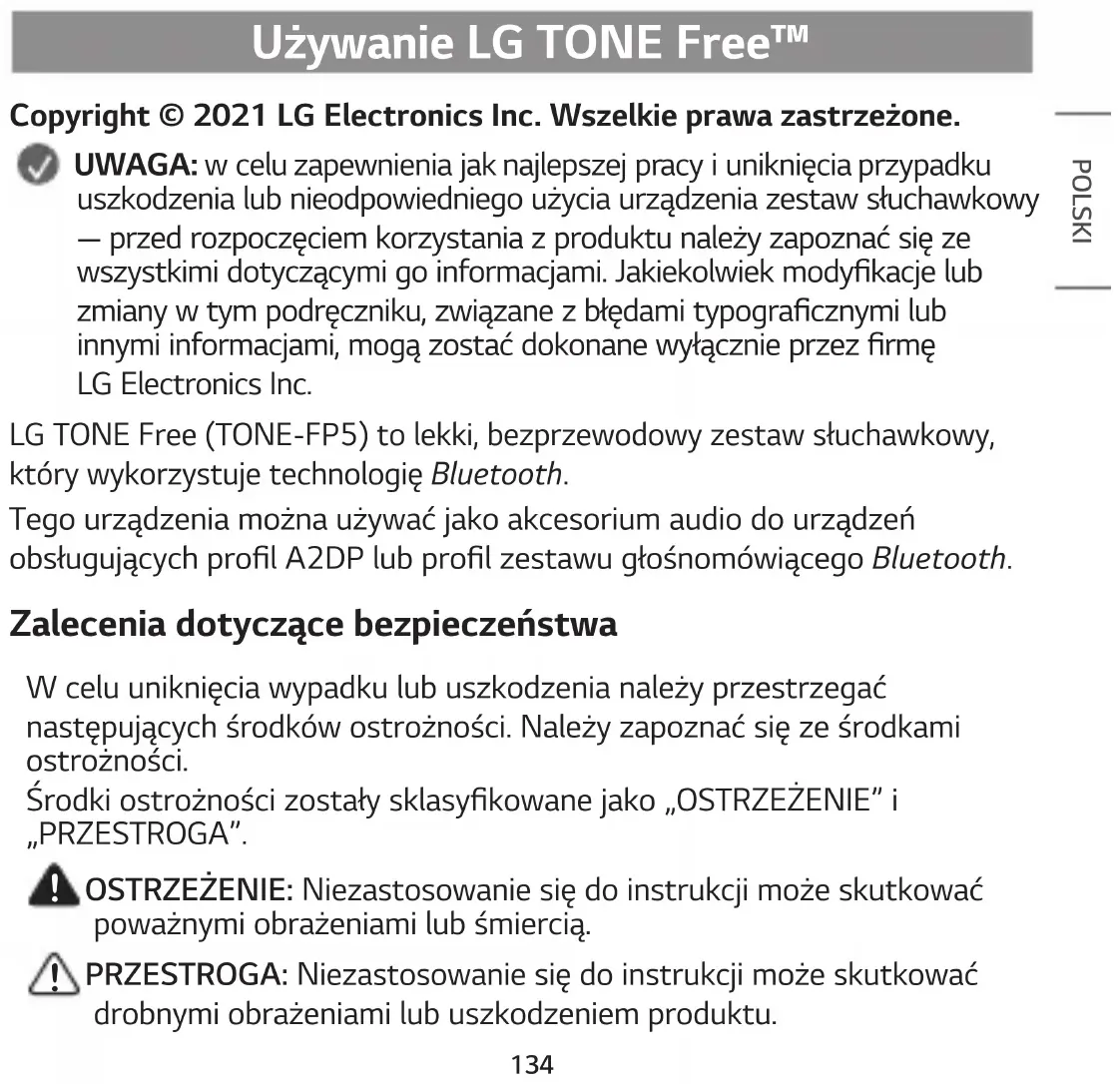 Copyright © 2021 LG Electronics Inc. Wszelkie prawa zastrzeżone. UWAGA: w celu zapewnienia jak najlepszej pracy i uniknięcia przypadku uszkodzenia lub nieodpowiedniego użycia urządzenia zestaw słuchawkowy — przed rozpoczęciem korzystania z produktu należy zapoznać się ze wszystkimi dotyczącymi go informacjami. Jakiekolwiek modykacje lub zmiany w tym podręczniku, związane z błędami typogracznymi lub innymi informacjami, mogą zostać dokonane wyłącznie przez rmę LG Electronics Inc. LG TONE Free (TONE-FP5) to lekki, bezprzewodowy zestaw słuchawkowy, który wykorzystuje technologię Bluetooth. Tego urządzenia można używać jako akcesorium audio do urządzeń obsługujących prol A2DP lub prol zestawu głośnomówiącego Bluetooth. Zalecenia dotyczące bezpieczeństwa W celu uniknięcia wypadku lub uszkodzenia należy przestrzegać następujących środków ostrożności. Należy zapoznać się ze środkami ostrożności. Środki ostrożności zostały sklasykowane jako „OSTRZEŻENIE” i „PRZESTROGA”.