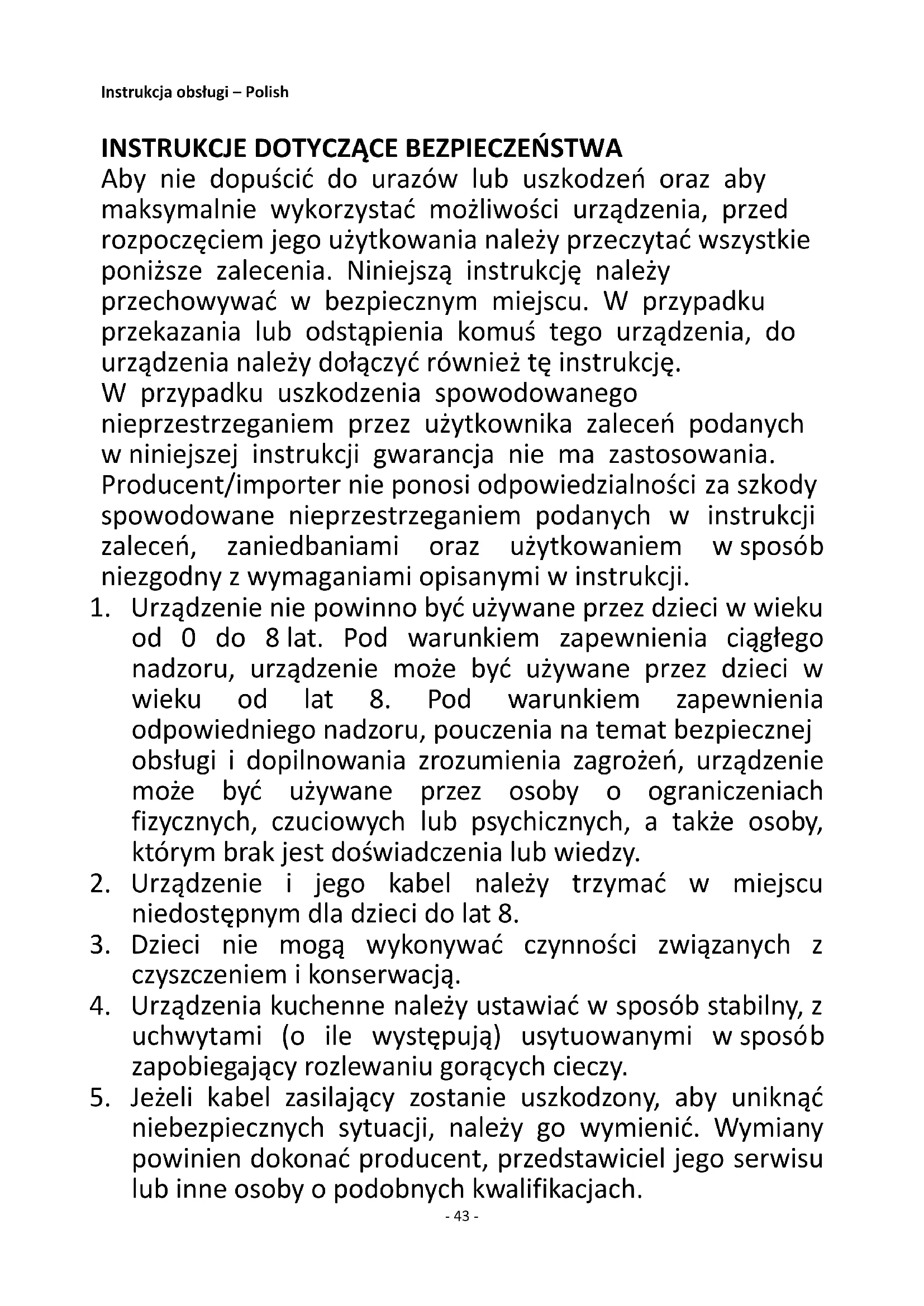 Aby nie dopuścić do urazów lub uszkodzeń oraz aby maksymalnie wykorzystać możliwości urządzenia, przed rozpoczęciem jego użytkowania należy przeczytać wszystkie poniższe zalecenia. Niniejszą instrukcję należy przechowywać w bezpiecznym miejscu. W przypadku przekazania lub odstąpienia komuś tego urządzenia, do urządzenia należy dołączyć również tę instrukcję. W przypadku uszkodzenia spowodowanego nieprzestrzeganiem przez użytkownika zaleceń podanych w niniejszej instrukcji gwarancja nie ma zastosowania. Producent/importer nie ponosi odpowiedzialności za szkody spowodowane nieprzestrzeganiem podanych w instrukcji zaleceń, zaniedbaniami oraz użytkowaniem w sposób niezgodny z wymaganiami opisanymi w instrukcji.