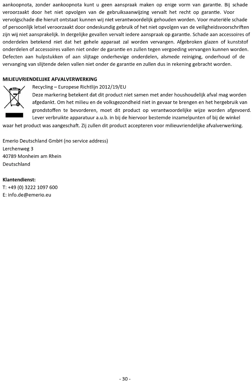 Przed dostarczeniem do klienta nasze urządzenia poddawane są rygorystycznej kontroli jakości. Jeśli, pomimo wszelkich starań, podczas produkcji lub transportu pojawi się uszkodzenie, należy zwrócić urządzenie do sprzedawcy. Dodatkowo do stosowanych powszechnie przepisów, nabywca ma prawo do reklamacji na podstawie,warunków niniejszej gwarancji: Dla każdego zakupionego urządzenia zapewniamy 2 lata gwarancji, poczynając od dnia zakupu. Uszkodzony produkt można zwrócić bezpośrednio w punkcie zakupu. Niniejsza gwarancja nie obejmuje uszkodzeń spowodowanych niewłaściwą obsługą urządzenia, usterek w wyniku modyfikacji i napraw wykonanych przez strony trzecie lub w wyniku użycia nieoryginalnych części.- 36 - Należy zachować dowód zakupu, który jest jedyną podstawą złożenia roszczenia gwarancyjnego. Producent nie ponosi odpowiedzialności za uszkodzenia powstałe w wyniku nieprzestrzegania instrukcji obsługi. Powoduje to unieważnienie gwarancji. Producent nie ponosi odpowiedzialności za szkody materiałowe ani obrażenia ciała spowodowane niewłaściwą obsługą urządzenia i nieprzestrzeganiem instrukcji obsługi. Uszkodzenie akcesoriów nie oznacza bezpłatnej wymiany całego urządzenia. W takim wypadku prosimy o kontakt z naszym serwisem. Stłuczone elementy szklane lub pęknięte elementy plastikowe są wymieniane za opłatą. Uszkodzenia materiałów eksploatacyjnych lub części podlegających zużyciu, a także czyszczenie, konserwacja i wymienia wspomnianych części nie jest objęta gwarancją i podlega opłacie.