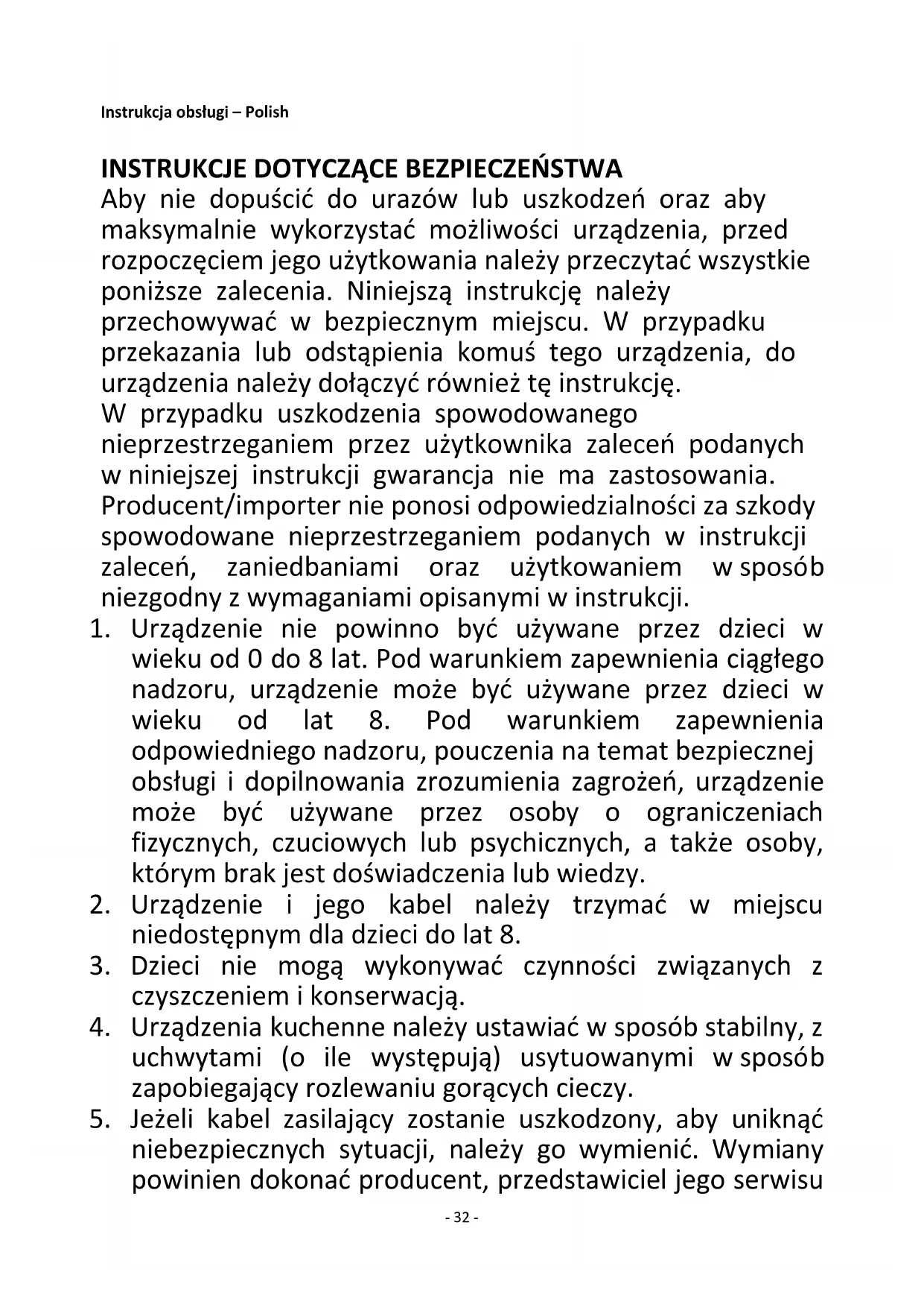 Aby nie dopuścić do urazów lub uszkodzeń oraz aby maksymalnie wykorzystać możliwości urządzenia, przed rozpoczęciem jego użytkowania należy przeczytać wszystkie poniższe zalecenia. Niniejszą instrukcję należy przechowywać w bezpiecznym miejscu. W przypadku przekazania lub odstąpienia komuś tego urządzenia, do urządzenia należy dołączyć również tę instrukcję. W przypadku uszkodzenia spowodowanego nieprzestrzeganiem przez użytkownika zaleceń podanych w niniejszej instrukcji gwarancja nie ma zastosowania. Producent/importer nie ponosi odpowiedzialności za szkody spowodowane nieprzestrzeganiem podanych w instrukcji zaleceń, zaniedbaniami oraz użytkowaniem w sposób niezgodny z wymaganiami opisanymi w instrukcji.
