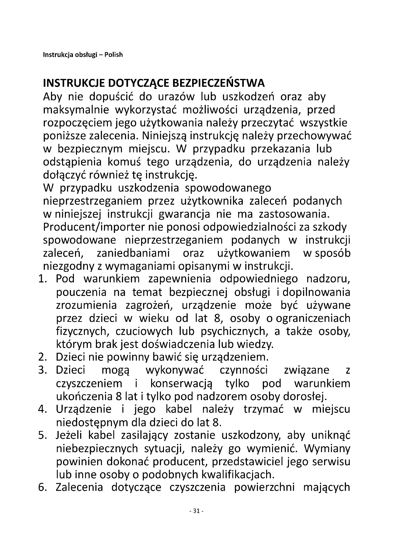 Aby nie dopuścić do urazów lub uszkodzeń oraz aby maksymalnie wykorzystać możliwości urządzenia, przed rozpoczęciem jego użytkowania należy przeczytać wszystkie poniższe zalecenia. Niniejszą instrukcję należy przechowywać w bezpiecznym miejscu. W przypadku przekazania lub odstąpienia komuś tego urządzenia, do urządzenia należy dołączyć również tę instrukcję. W przypadku uszkodzenia spowodowanego nieprzestrzeganiem przez użytkownika zaleceń podanych w niniejszej instrukcji gwarancja nie ma zastosowania. Producent/importer nie ponosi odpowiedzialności za szkody spowodowane nieprzestrzeganiem podanych w instrukcji zaleceń, zaniedbaniami oraz użytkowaniem w sposób niezgodny z wymaganiami opisanymi w instrukcji.