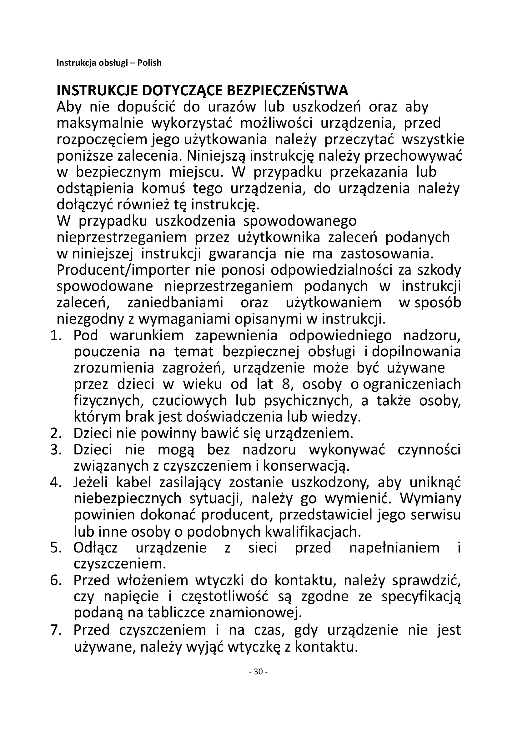 Aby nie dopuścić do urazów lub uszkodzeń oraz aby maksymalnie wykorzystać możliwości urządzenia, przed rozpoczęciem jego użytkowania należy przeczytać wszystkie poniższe zalecenia. Niniejszą instrukcję należy przechowywać w bezpiecznym miejscu. W przypadku przekazania lub odstąpienia komuś tego urządzenia, do urządzenia należy dołączyć również tę instrukcję. W przypadku uszkodzenia spowodowanego nieprzestrzeganiem przez użytkownika zaleceń podanych w niniejszej instrukcji gwarancja nie ma zastosowania. Producent/importer nie ponosi odpowiedzialności za szkody spowodowane nieprzestrzeganiem podanych w instrukcji zaleceń, zaniedbaniami oraz użytkowaniem w sposób niezgodny z wymaganiami opisanymi w instrukcji.