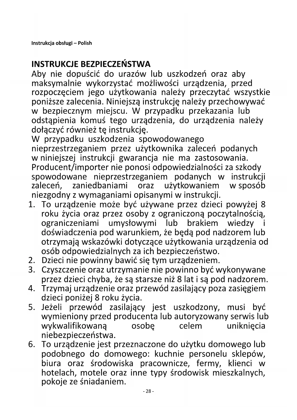 Aby nie dopuścić do urazów lub uszkodzeń oraz aby maksymalnie wykorzystać możliwości urządzenia, przed rozpoczęciem jego użytkowania należy przeczytać wszystkie poniższe zalecenia. Niniejszą instrukcję należy przechowywać w bezpiecznym miejscu. W przypadku przekazania lub odstąpienia komuś tego urządzenia, do urządzenia należy dołączyć również tę instrukcję. W przypadku uszkodzenia spowodowanego nieprzestrzeganiem przez użytkownika zaleceń podanych w niniejszej instrukcji gwarancja nie ma zastosowania. Producent/importer nie ponosi odpowiedzialności za szkody spowodowane nieprzestrzeganiem podanych w instrukcji zaleceń, zaniedbaniami oraz użytkowaniem w sposób niezgodny z wymaganiami opisanymi w instrukcji.