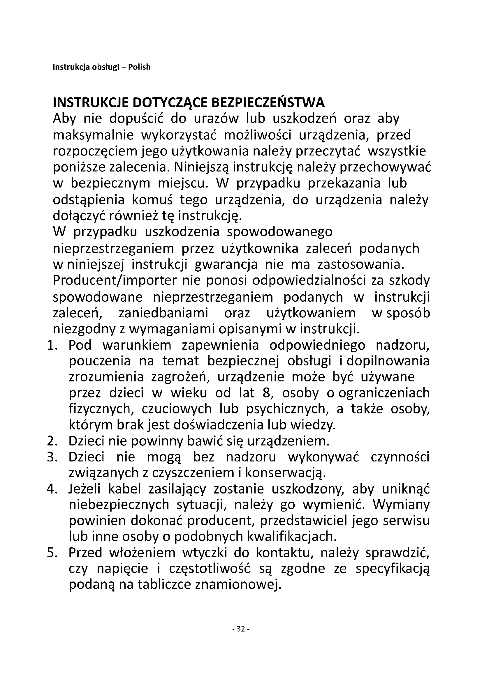 Aby nie dopuścić do urazów lub uszkodzeń oraz aby maksymalnie wykorzystać możliwości urządzenia, przed rozpoczęciem jego użytkowania należy przeczytać wszystkie poniższe zalecenia. Niniejszą instrukcję należy przechowywać w bezpiecznym miejscu. W przypadku przekazania lub odstąpienia komuś tego urządzenia, do urządzenia należy dołączyć również tę instrukcję. W przypadku uszkodzenia spowodowanego nieprzestrzeganiem przez użytkownika zaleceń podanych w niniejszej instrukcji gwarancja nie ma zastosowania. Producent/importer nie ponosi odpowiedzialności za szkody spowodowane nieprzestrzeganiem podanych w instrukcji zaleceń, zaniedbaniami oraz użytkowaniem w sposób niezgodny z wymaganiami opisanymi w instrukcji.