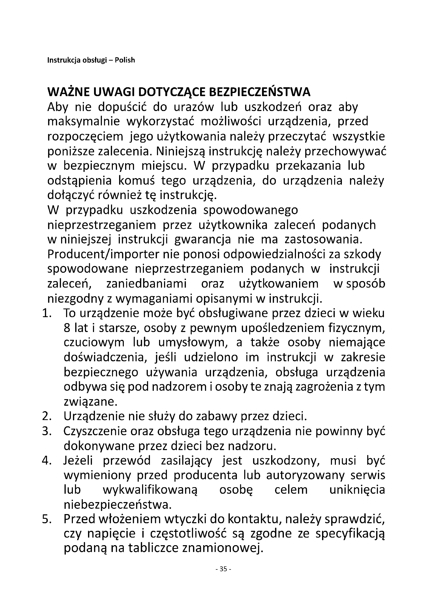 Voor informatie voor de consument over de installatie, de werking en het onderhoud van het product en de AEEA-informatie, raadpleeg de gebruiksaanwijzing die zich in de verpakking bevindt.- 35 - Instrukcja obsługi – Polish WAŻNE UWAGI DOTYCZĄCE BEZPIECZEŃSTWA Aby nie dopuścić do urazów lub uszkodzeń oraz aby maksymalnie wykorzystać możliwości urządzenia, przed rozpoczęciem jego użytkowania należy przeczytać wszystkie poniższe zalecenia. Niniejszą instrukcję należy przechowywać w bezpiecznym miejscu. W przypadku przekazania lub odstąpienia komuś tego urządzenia, do urządzenia należy dołączyć również tę instrukcję. W przypadku uszkodzenia spowodowanego nieprzestrzeganiem przez użytkownika zaleceń podanych w niniejszej instrukcji gwarancja nie ma zastosowania. Producent/importer nie ponosi odpowiedzialności za szkody spowodowane nieprzestrzeganiem podanych w instrukcji zaleceń, zaniedbaniami oraz użytkowaniem w sposób niezgodny z wymaganiami opisanymi w instrukcji.
