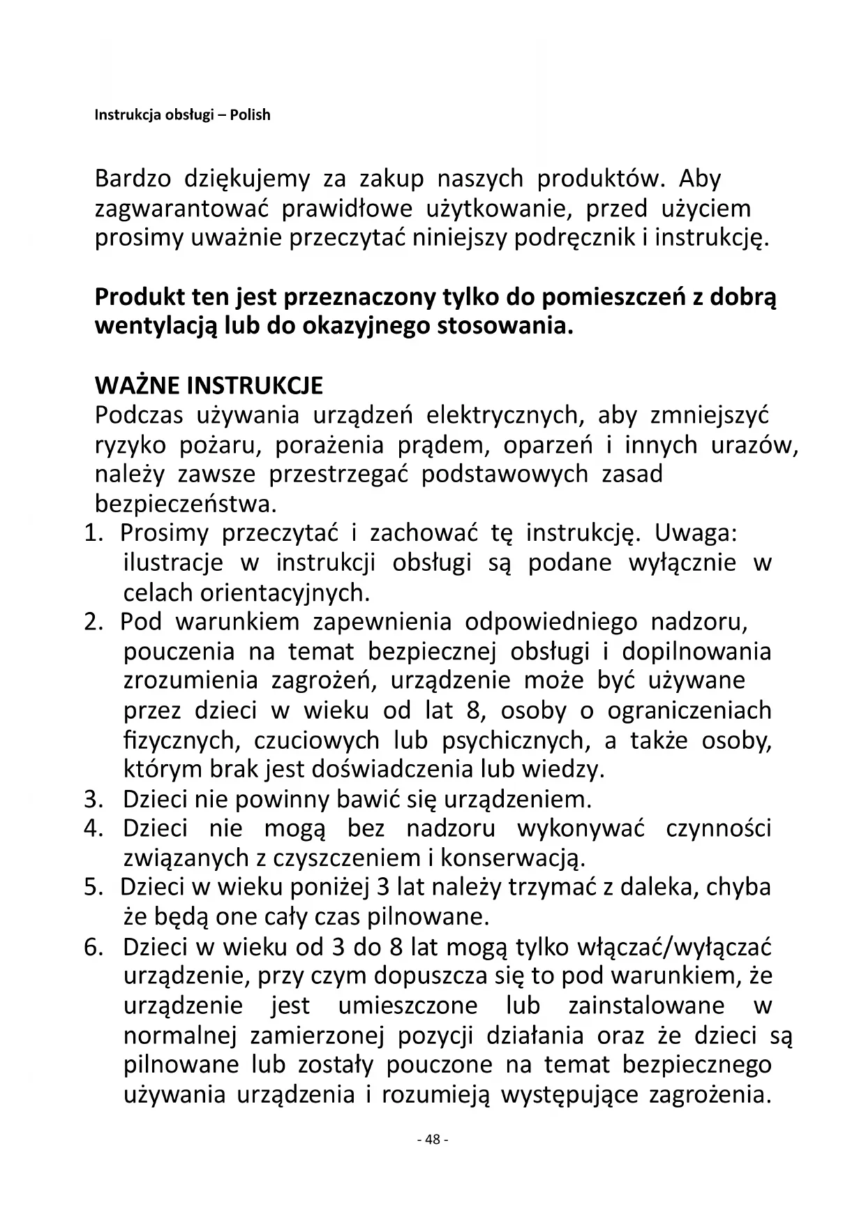 urządzenie, przy czym dopuszcza się to pod warunkiem, że urządzenie jest umieszczone lub zainstalowane w normalnej zamierzonej pozycji działania oraz że dzieci są pilnowane lub zostały pouczone na temat bezpiecznego używania urządzenia i rozumieją występujące zagrożenia.- 49 - Dzieci w wieku od 3 do 8 lat nie powinny wkładać wtyczki do kontaktu, nastawiać urządzenia, czyścić go, ani wykonywać przy nim czynności konserwacyjnych.
