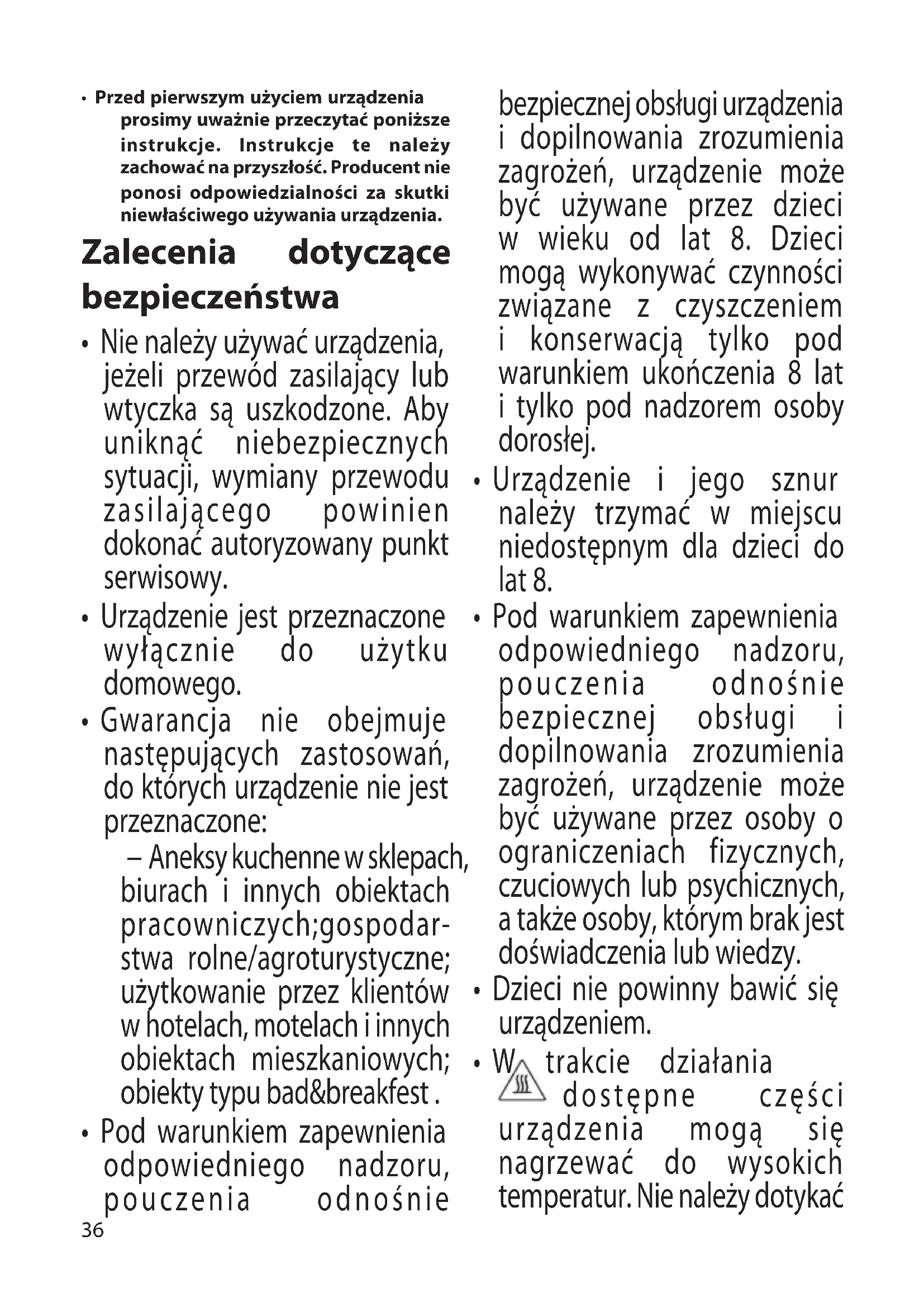 - Pod warunkiem zapewnienia odpowiedniego nadzoru, pouczenia odnośnie bezpiecznej obsługi urządzenia i dopilnowania zrozumienia zagrożeń, urządzenie może być używane przez dzieci w wieku od lat 8. Dzieci mogą wykonywać czynności związane z czyszczeniem i konserwacją tylko pod warunkiem ukończenia 8 lat i tylko pod nadzorem osoby dorosłej.