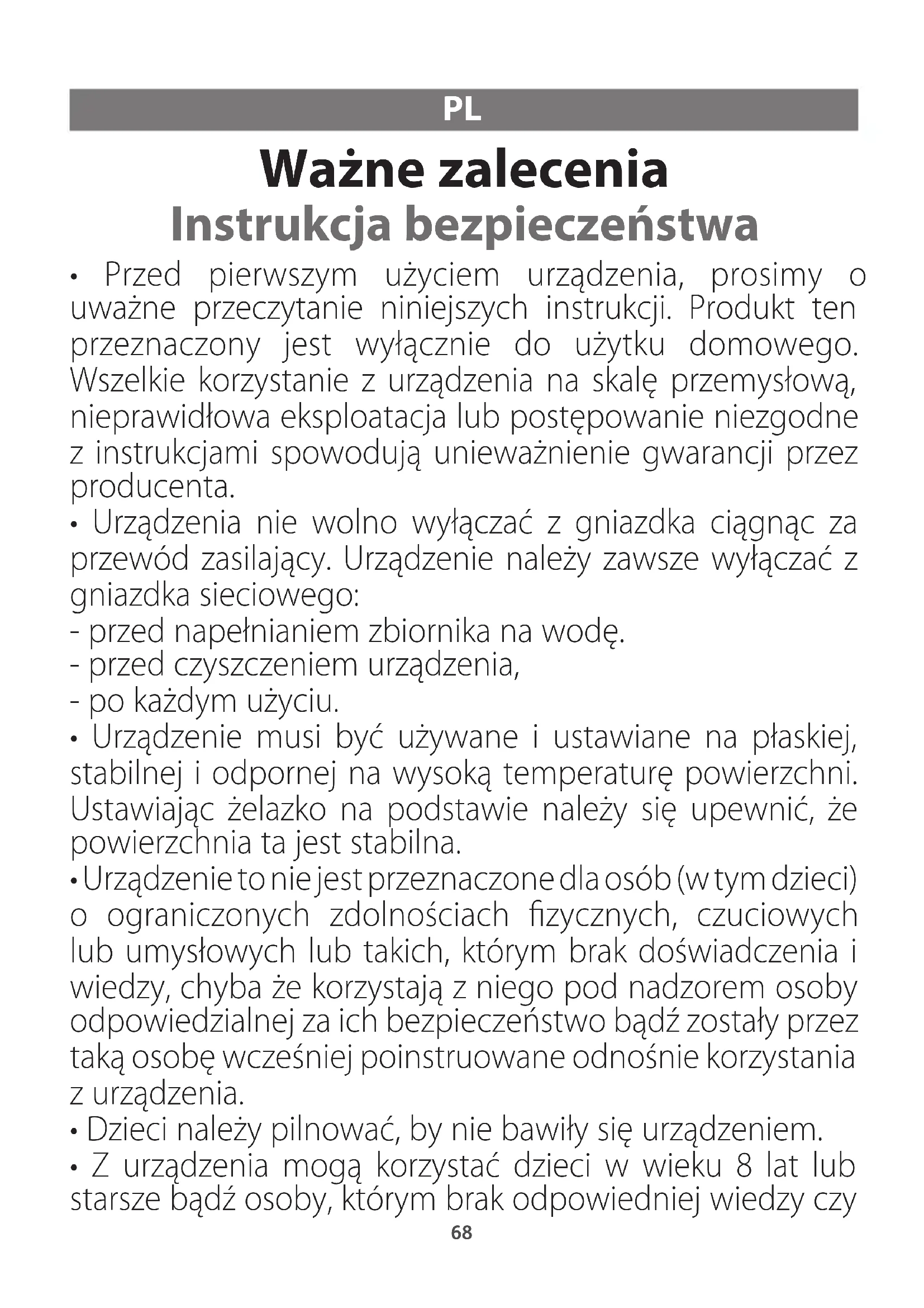 - Z urządzenia mogą korzystać dzieci w wieku 8 lat lub starsze bądź osoby, którym brak odpowiedniej wiedzy czy69 też doświadczenia, a także osoby o ograniczonych zdolnościach zycznych, czuciowych lub umysłowych pod warunkiem, że zostały wcześniej dokładnie poinstruowane odnośnie korzystania z urządzenia, są pod nadzorem i rozumieją zagrożenia związane w korzystaniem z niego. Nie należy pozwalać dzieciom bawić się urządzeniem. Nie wolno, by dzieci wykonywały operacje czyszczenia i konserwacji będąc bez nadzoru. Żelazko i jego kabel należy chronić przed dziećmi do lat 8, gdy jest podłączone do prądu lub podczas stygnięcia.