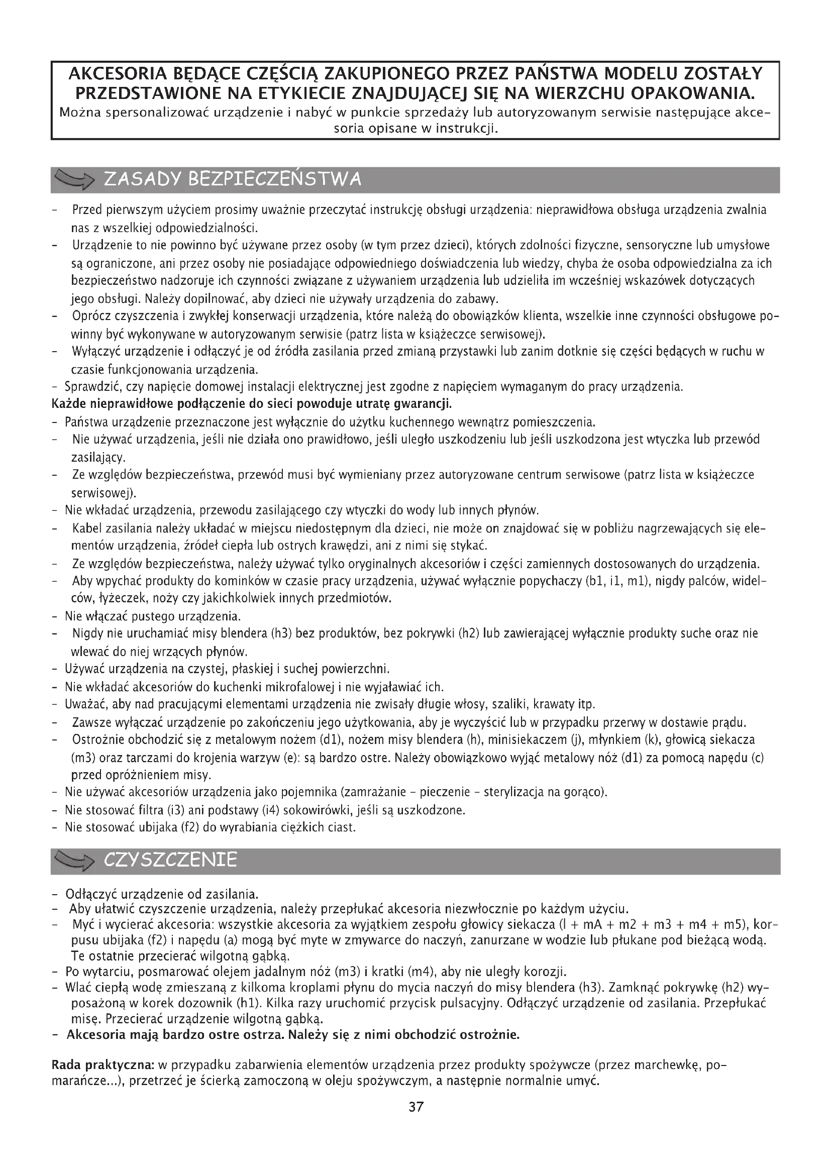 AKCESORIA BĘDĄCE CZĘŚCIĄ ZAKUPIONEGO PRZEZ PAŃSTWA MODELU ZOSTAŁY PRZEDSTAWIONE NA ETYKIECIE ZNAJDUJĄCEJ SIĘ NA WIERZCHU OPAKOWANIA. Mona spersonalizować urządzenie i nabyć w punkcie sprzeday lub autoryzowanym serwisie następujące akce- soria opisane w instrukcji. ZASADY BEZPIECZE ŃSTWA CZYSZCZENIE - Przed pierwszym uyciem prosimy uwanie przeczytać instrukcję obsługi urządzenia: nieprawidłowa obsługa urządzenia zwalnia nas z wszelkiej odpowiedzialności. - Urządzenie to nie powinno być uywane przez osoby (w tym przez dzieci), których zdolności fizyczne, sensoryczne lub umysłowe są ograniczone, ani przez osoby nie posiadające odpowiedniego doświadczenia lub wiedzy, chyba e osoba odpowiedzialna za ich bezpieczeństwo nadzoruje ich czynności związane z uywaniem urządzenia lub udzieliła im wcześniej wskazówek dotyczących jego obsługi. Naley dopilnować, aby dzieci nie uywały urządzenia do zabawy. - Oprócz czyszczenia i zwykłej konserwacji urządzenia, które naleą do obowiązków klienta, wszelkie inne czynności obsługowe po- winny być wykonywane w autoryzowanym serwisie (patrz lista w ksiąeczce serwisowej). - Wyłączyć urządzenie i odłączyć je od źródła zasilania przed zmianą przystawki lub zanim dotknie się części będących w ruchu w czasie funkcjonowania urządzenia. - Sprawdzić, czy napięcie domowej instalacji elektrycznej jest zgodne z napięciem wymaganym do pracy urządzenia. Kade nieprawidłowe podłączenie do sieci powoduje utratę gwarancji. - Państwa urządzenie przeznaczone jest wyłącznie do uytku kuchennego wewnątrz pomieszczenia. - Nie uywać urządzenia, jeśli nie działa ono prawidłowo, jeśli uległo uszkodzeniu lub jeśli uszkodzona jest wtyczka lub przewód zasilający. - Ze względów bezpieczeństwa, przewód musi być wymieniany przez autoryzowane centrum serwisowe (patrz lista w ksiąeczce serwisowej). - Nie wkładać urządzenia, przewodu zasilającego czy wtyczki do wody lub innych płynów. - Kabel zasilania naley układać w miejscu niedostępnym dla dzieci, nie moe on znajdować się w pobliu nagrzewających się ele- mentów urządzenia, źródeł ciepła lub ostrych krawędzi, ani z nimi się stykać. - Ze względów bezpieczeństwa, naley uywać tylko oryginalnych akcesoriów i części zamiennych dostosowanych do urządzenia. - Aby wpychać produkty do kominków w czasie pracy urządzenia, uywać wyłącznie popychaczy (b1, i1, m1), nigdy palców, widel- ców, łyeczek, noy czy jakichkolwiek innych przedmiotów. - Nie włączać pustego urządzenia. - Nigdy nie uruchamiać misy blendera (h3) bez produktów, bez pokrywki (h2) lub zawierającej wyłącznie produkty suche oraz nie wlewać do niej wrzących płynów. - Uywać urządzenia na czystej, płaskiej i suchej powierzchni. - Nie wkładać akcesoriów do kuchenki mikrofalowej i nie wyjaławiać ich. - Uwaać, aby nad pracującymi elementami urządzenia nie zwisały długie włosy, szaliki, krawaty itp. - Zawsze wyłączać urządzenie po zakończeniu jego uytkowania, aby je wyczyścić lub w przypadku przerwy w dostawie prądu. - Ostronie obchodzić się z metalowym noem (d1), noem misy blendera (h), minisiekaczem (j), młynkiem (k), głowicą siekacza (m3) oraz tarczami do krojenia warzyw (e): są bardzo ostre. Naley obowiązkowo wyjąć metalowy nó (d1) za pomocą napędu (c) przed oprónieniem misy. - Nie uywać akcesoriów urządzenia jako pojemnika (zamraanie - pieczenie - sterylizacja na gorąco). - Nie stosować filtra (i3) ani podstawy (i4) sokowirówki, jeśli są uszkodzone. - Nie stosować ubijaka (f2) do wyrabiania ciękich ciast. - Odłączyć urządzenie od zasilania. - Aby ułatwić czyszczenie urządzenia, naley przepłukać akcesoria niezwłocznie po kadym uyciu. - Myć i wycierać akcesoria: wszystkie akcesoria za wyjątkiem zespołu głowicy siekacza (l + mA + m2 + m3 + m4 + m5), kor- pusu ubijaka (f2) i napędu (a) mogą być myte w zmywarce do naczyń, zanurzane w wodzie lub płukane pod bieącą wodą. Te ostatnie przecierać wilgotną gąbką. - Po wytarciu, posmarować olejem jadalnym nó (m3) i kratki (m4), aby nie uległy korozji. - Wlać ciepłą wodę zmieszaną z kilkoma kroplami płynu do mycia naczyń do misy blendera (h3). Zamknąć pokrywkę (h2) wy- posaoną w korek dozownik (h1). Kilka razy uruchomić przycisk pulsacyjny. Odłączyć urządzenie od zasilania. Przepłukać misę. Przecierać urządzenie wilgotną gąbką. - Akcesoria mają bardzo ostre ostrza. Naley się z nimi obchodzić ostronie. Rada praktyczna: w przypadku zabarwienia elementów urządzenia przez produkty spoywcze (przez marchewkę, po- marańcze...), przetrzeć je ścierką zamoczoną w oleju spoywczym, a następnie normalnie umyć.38 CO ROBI Ć, JEŚLI URZĄDZENIE NIE DZIAŁA? WYRZUCANIE OPAKOWAŃ