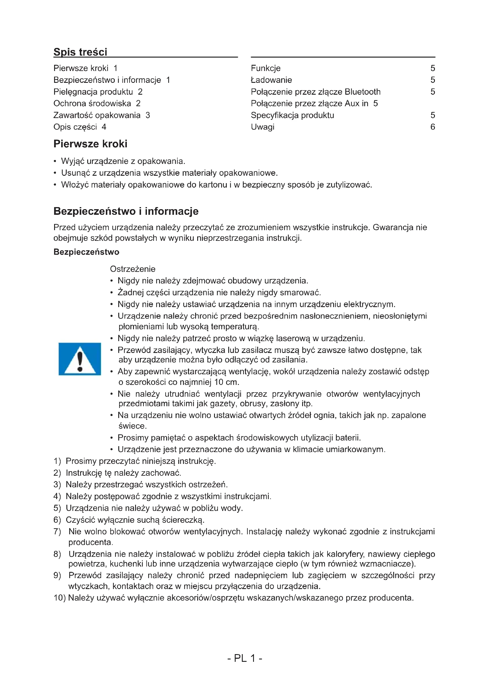 Spis treści Pierwsze kroki 1 Bezpieczeństwo i informacje 1 Pielęgnacja produktu 2 Ochrona środowiska 2 Zawartość opakowania 3 Opis części 4 Funkcje: 5 Ładowanie: 5 Połączenie przez złącze Bluetooth: 5 Połączenie przez złącze Aux in 5 Specykacja produktu 5 Uwagi: 6- PL 2 -