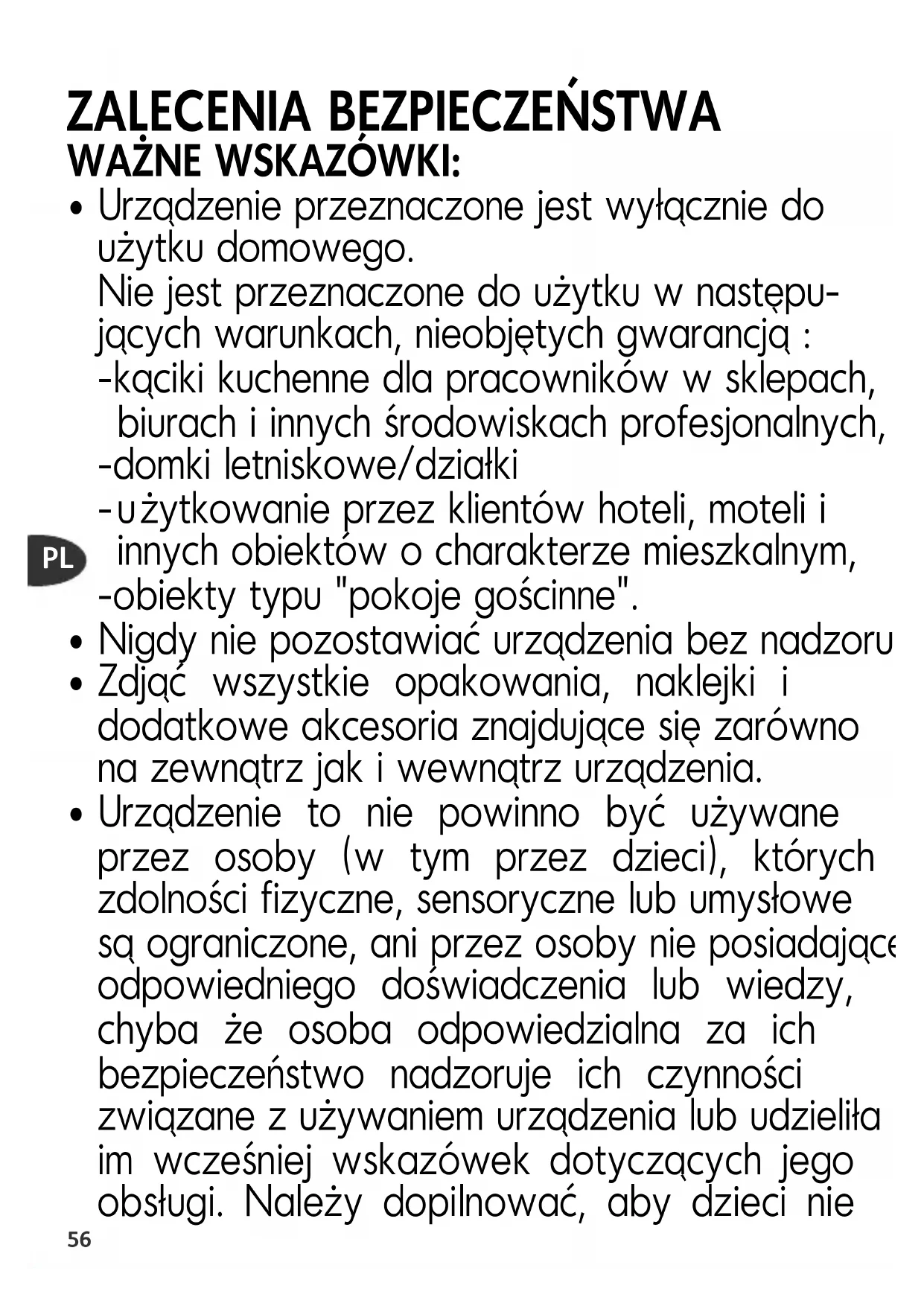 - Urządzenie nie powinno być użytkowane przez dzieci poniżej 8 roku życia, oraz osoby które są upośledzone fizycznie lub umysłowo, jak również przez osoby nie posiadające doświadczenia i wiedzy, z wyjątkiem przypadków, kiedy znajdują się one pod opieką osoby odpowiedzialnej za ich bezpieczeństwo lub zostały przez nią poinstruowane w zakresie użytkowania urządzenia. Dzieci nie mogą bawić się urządzeniem. Czyszczenie i konserwacja urządzenia nie może być przeprowadzana przez dzieci poniżej 8 roku życia, chyba że są one nadzorowane przez osoby odpowiedzialne za ich bezpieczeństwo.