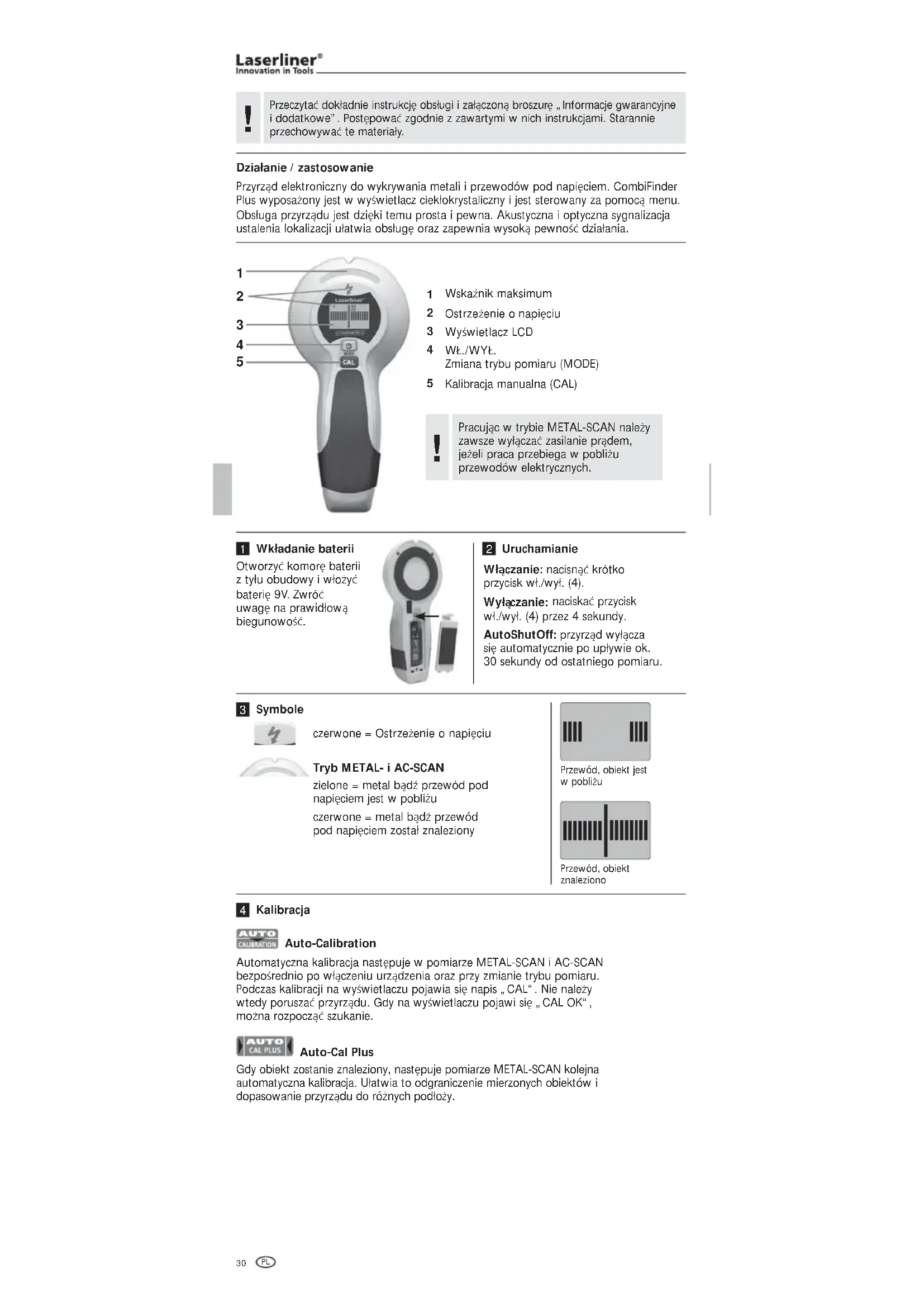 PrzyrzŅd elektroniczny do wykrywania metali i przewodów pod napiŐciem. CombiFinder Plus wyposażony jest w wyūwietlacz ciekÙokrystaliczny i jest sterowany za pomocŅ menu. ObsÙuga przyrzŅdu jest dziŐki temu prosta i pewna. Akustyczna i optyczna sygnalizacja ustalenia lokalizacji uÙatwia obsÙugŐ oraz zapewnia wysokŅ pewnoūņ dziaÙania. WskaŻnik maksimum Ostrzeżenie o napiŐciu Wyūwietlacz LCD WØ./WYØ. Zmiana trybu pomiaru (MODE) Kalibracja manualna (CAL) Otworzyņ komorŐ baterii z tyÙu obudowy i wÙożyņ bateriŐ 9V. Zwróņ uwagŐ na prawidÙowŅ biegunowoūņ. WkĜadanie baterii WĜâczanie: nacisnŅņ krótko przycisk wÙ./wyÙ. (4). WyĜâ czanie: naciskaņ przycisk wÙ./wyÙ. (4) przez 4 sekundy. AutoShutOff: przyrzŅd wyÙŅcza siŐ automatycznie po upÙywie ok. 30 sekundy od ostatniego pomiaru. Uruchamianie Auto-Calibration Automatyczna kalibracja nastŐpuje w pomiarze METAL-SCAN i AC-SCAN bezpoūrednio po wÙŅczeniu urzŅdzenia oraz przy zmianie trybu pomiaru. Podczas kalibracji na wyūwietlaczu pojawia siŐ napis „CAL“. Nie należy wtedy poruszaņ przyrzŅdu. Gdy na wyūwietlaczu pojawi siŐ „CAL OK“, można rozpoczŅņ szukanie. Auto-Cal Plus Gdy obiekt zostanie znaleziony, nastŐpuje pomiarze METAL-SCAN kolejna automatyczna kalibracja. UÙatwia to odgraniczenie mierzonych obiektów i dopasowanie przyrzŅdu do różnych podÙoży. Kalibracja PracujŅc w trybie METAL-SCAN należy zawsze wyÙŅczaņ zasilanie prŅdem, jeżeli praca przebiega w pobliżu przewodów elektrycznych.
