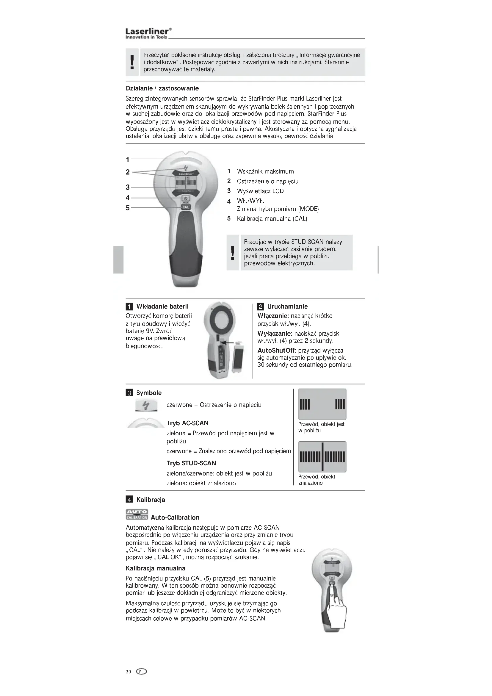 DziaĜanie / zastosowanie Szereg zintegrowanych sensorów sprawia, że StarFinder Plus marki Laserliner jest efektywnym urzŅdzeniem skanujŅcym do wykrywania belek ūciennych i poprzecznych w suchej zabudowie oraz do lokalizacji przewodów pod napiŐciem. StarFinder Plus wyposażony jest w wyūwietlacz ciekÙokrystaliczny i jest sterowany za pomocŅ menu. ObsÙuga przyrzŅdu jest dziŐki temu prosta i pewna. Akustyczna i optyczna sygnalizacja ustalenia lokalizacji uÙatwia obsÙugŐ oraz zapewnia wysokŅ pewnoūņ dziaÙania. WskaŻnik maksimum Ostrzeżenie o napiŐciu Wyūwietlacz LCD WØ./WYØ. Zmiana trybu pomiaru (MODE) Kalibracja manualna (CAL) Otworzyņ komorŐ baterii z tyÙu obudowy i wÙożyņ bateriŐ 9V. Zwróņ uwagŐ na prawidÙowŅ biegunowoūņ. WkĜadanie baterii WĜâczanie: nacisnŅņ krótko przycisk wÙ./wyÙ. (4). WyĜâczanie: naciskaņ przycisk wÙ./wyÙ. (4) przez 2 sekundy. AutoShutOff: przyrzŅd wyÙŅcza siŐ automatycznie po upÙywie ok. 30 sekundy od ostatniego pomiaru. Uruchamianie Auto-Calibration Automatyczna kalibracja nastŐpuje w pomiarze AC-SCAN bezpoūrednio po wÙŅczeniu urzŅdzenia oraz przy zmianie trybu pomiaru. Podczas kalibracji na wyūwietlaczu pojawia siŐ napis „CAL“. Nie należy wtedy poruszaņ przyrzŅdu. Gdy na wyūwietlaczu pojawi siŐ „CAL OK“, można rozpoczŅņ szukanie. Kalibracja Kalibracja manualna Po naciūniŐciu przycisku CAL (5) przyrzŅd jest manualnie kalibrowany. W ten sposób można ponownie rozpoczŅņ pomiar lub jeszcze dokÙadniej odgraniczyņ mierzone obiekty. MaksymalnŅ czuÙoūņ przyrzŅdu uzyskuje siŐ trzymajŅc go podczas kalibracji w powietrzu. Może to byņ w niektórych miejscach celowe w przypadku pomiarów AC-SCAN. PracujŅc w trybie STUD-SCAN należy zawsze wyÙŅczaņ zasilanie prŅdem, jeżeli praca przebiega w pobliżu przewodów elektrycznych.