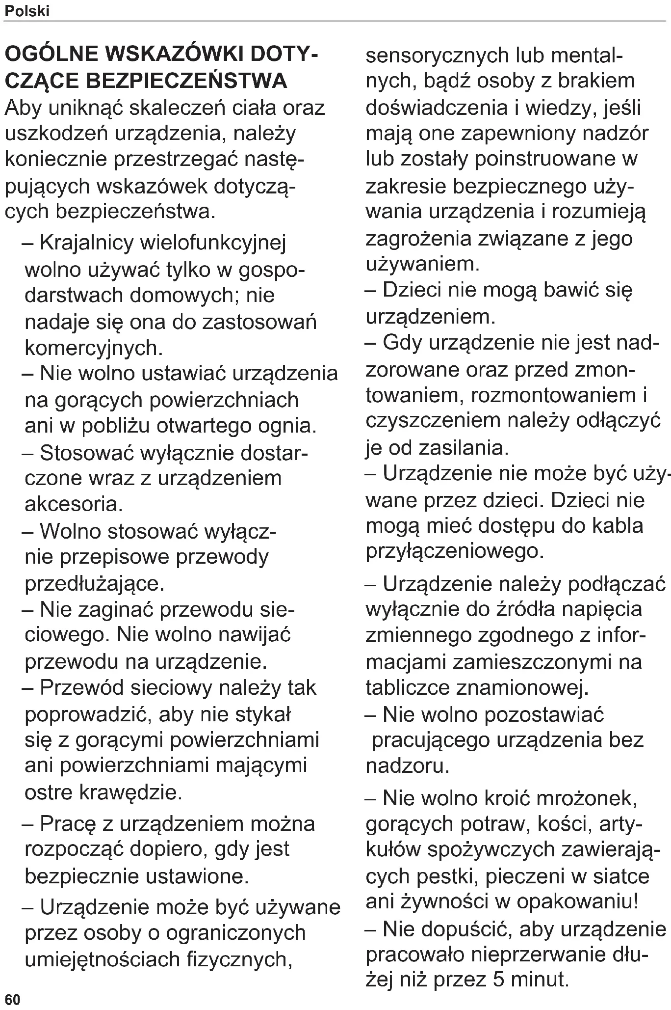 Aby uniknąć skaleczeń ciała oraz uszkodzeń urządzenia, należy koniecznie przestrzegać nastę- pujących wskazówek dotyczą- cych bezpieczeństwa. – Krajalnicy wielofunkcyjnej wolno używać tylko w gospo- darstwach domowych; nie nadaje się ona do zastosowań komercyjnych. – Nie wolno ustawiać urządzenia na gorących powierzchniach ani w pobliżu otwartego ognia. – Stosować wyłącznie dostar- czone wraz z urządzeniem akcesoria. – Wolno stosować wyłącz- nie przepisowe przewody przedłużające. – Nie zaginać przewodu sie- ciowego. Nie wolno nawijać przewodu na urządzenie. – Przewód sieciowy należy tak poprowadzić, aby nie stykał się z gorącymi powierzchniami ani powierzchniami mającymi ostre krawędzie. – Pracę z urządzeniem można rozpocząć dopiero, gdy jest bezpiecznie ustawione. – Urządzenie może być używane przez osoby o ograniczonych umiejętnościach zycznych, sensorycznych lub mental- nych, bądź osoby z brakiem doświadczenia i wiedzy, jeśli mają one zapewniony nadzór lub zostały poinstruowane w zakresie bezpiecznego uży- wania urządzenia i rozumieją zagrożenia związane z jego używaniem. – Dzieci nie mogą bawić się urządzeniem. – Gdy urządzenie nie jest nad- zorowane oraz przed zmon- towaniem, rozmontowaniem i czyszczeniem należy odłączyć je od zasilania. – Urządzenie nie może być uży- wane przez dzieci. Dzieci nie mogą mieć dostępu do kabla przyłączeniowego. – Urządzenie należy podłączać wyłącznie do źródła napięcia zmiennego zgodnego z infor- macjami zamieszczonymi na tabliczce znamionowej. – Nie wolno pozostawiać pracującego urządzenia bez nadzoru. – Nie wolno kroić mrożonek, gorących potraw, kości, arty- kułów spożywczych zawierają- cych pestki, pieczeni w siatce ani żywności w opakowaniu! – Nie dopuścić, aby urządzenie pracowało nieprzerwanie dłu- żej niż przez 5 minut.61 Niebezpieczeństwo porażenia prądem – W przypadku zakłóceń w pracy, zawsze przed przy- stąpieniem do czyszczenia urządzenia oraz gdy urządze- nie nie jest używane, trzeba wyciągnąć wtyczkę z gniazda sieciowego. Należy ciągnąć za wtyczkę, nie za przewód. – Nie wolno zanurzać urządze- nia w wodzie. Nie wolno wysta- wiać urządzenia na deszcz ani w inny sposób narażać na działanie wilgoci. Jeżeli urządzenie wpadnie do wody, najpierw należy wyciągnąć wtyczkę z gniazda siecio- wego i dopiero potem wyjąć urządzenie z wody. Przed ponownym uruchomieniem urządzenia zlecić jego kontrolę w autoryzowanym punkcie serwisowym. – Nie dotykać urządzenia wilgot- nymi rękami. Nie używać urzą- dzenia, stojąc na wilgotnym lub mokrym podłożu bądź jeżeli urządzenie jest wilgotne albo mokre. Nie używać urządzenia na zewnątrz pomieszczeń. – W przypadku stwierdzenia uszkodzenia elementów urzą- dzenia należy natychmiast wyłączyć urządzenie i skontak- tować się z punktem obsługi klienta rmy ritterwerk. – Uszkodzony przewód zasila- jący musi zostać wymieniony przez producenta, punkt obsługi klienta producenta lub inne wykwalikowane osoby; pozwoli to uniknąć zagrożeń. Niebezpieczeństwo skaleczenia – Nie wolno używać niniejszego urządzenia bez prowadnicy produktów i popychacza małych produktów, chyba że wielkość i kształt krojonego produktu na to nie pozwalają. – Przed wymianą akcesoriów lub elementów dodatkowych, które poruszają się podczas pracy, urządzenie należy wyłączyć i odłączyć od napię- cia sieciowego. – Nóż obrotowy jest bardzo ostry. – Podczas pracy urządzenia nie wolno nigdy dotykać noża obrotowego! – Przed przystąpieniem do czyszczenia urządzenia należy je wyłączyć, wyciągnąć wtyczkę z gniazdka i przesta- wić pokrętło regulacji grubości krojenia do pozycji „0”. – Po wyłączeniu urządzenia nóż obraca się jeszcze przez chwilę. Polski62 Rozłożyć ilustracje znajdujące się za przednią oraz tylną okładką instrukcji. Przed uruchomieniem urządze- nia należy dokładnie przeczytać instrukcję obsługi. Zachować instrukcję obsługi i w przypadku przekazania urządzenia następ- nemu użytkownikowi przekazać ją wraz z urządzeniem. Alternatywnie można również skorzystać z aktualnej instrukcji obsługi, dostępnej na stronie www.ritterwerk.de. PRZEZNACZENIE Krajalnica wielofunkcyjna prze- znaczona jest do krojenia produk- tów spożywczych używanych w gospodarstwie domowym. Krajalnica uniwersalna jest przeznaczona do kontaktu z żywnością. Użycie niezgodne z przeznacze- niem lub niewłaściwa obsługa mogą spowodować poważne skaleczenia ciała lub uszkodze- nie urządzenia. W konsekwencji wygasają wszelkie prawa z tytułu gwarancji i rękojmi. URUCHOMIENIE Przygotowanie Wyjąć ostrożnie urządzenie z opakowania. Usunąć wszystkie elementy opakowania, należy przechowywać je wraz z opa- kowaniem. Przed kontaktem urządzenia z artykułami spożyw- czymi należy je oczyścić (patrz: CZYSZCZENIE). Ustawianie urządzenia