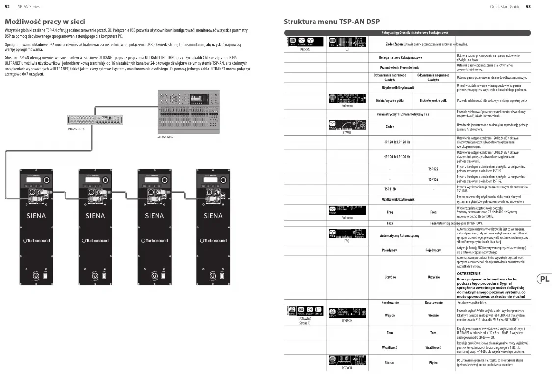 Żaden Żaden Ustawia pasmo przenoszenia na ustawienie domyślne. Relacja na żywo Relacja na żywo Ustawia pasmo przenoszenia na typowe ustawienie dźwięku na żywo. Przemówienie Przemówienie Ustawia pasmo przenoszenia dla optymalnej zrozumiałości mowy. Odtwarzanie nagranego dźwięku Odtwarzanie nagranego dźwięku Ustawia pasmo przenoszenia idealne do odtwarzania muzyki. Użytkownik Użytkownik Umożliwia zdeniowanie własnego ustawienia pasma przenoszenia poprzez wejście do odpowiedniego podmenu. Podmenu Niskie/wysokie półki Niskie/wysokie półki Pozwala zdeniować ltr półkowy o niskiej i wysokiej półce. Parametryczny 1 i 2 Parametryczny 1 i 2 Pozwala zdeniować parametryczny korektor dzwonkowy (częstotliwość, jakość i wzmocnienie). XOVER Żaden - Urządzenie jest ustawione na domyślną reprodukcję pełnego zakresu / subwoofera. HP 120 Hz LP 120 Hz Ustawienie wstępne z ltrem 120 Hz 24 dB / oktawę dla zwrotnicy między subwooferem a głośnikami szerokopasmowymi. HP 100 Hz LP 100 Hz Ustawienie wstępne z ltrem 100 Hz 24 dB / oktawę dla zwrotnicy między subwooferem a głośnikami pełnozakresowymi. - TSP122 Preset z idealnymi ustawieniami do użytku w połączeniu z pełnozakresowym głośnikiem TSP122. - TSP152 Preset z idealnymi ustawieniami do użytku w połączeniu z pełnozakresowym głośnikiem TSP152. TSP118B - Preset z wyrównaniem górnoprzepustowym dla subwoofera TSP118B. Użytkownik Użytkownik Podmenu zwrotnicy użytkownika do łączenia z innymi systemami głośników pełnozakresowych lub subwoofera Podmenu Freq Freq Wybierz żądaną częstotliwość podziału: Systemy pełnozakresowe: 75 Hz do 400 Hz Systemy subwooferów: 50 Hz do 150 Hz Faza Faza Ustaw fazę bezwzględną (0° lub 180°). FBQ Automatyczny Automatyczny Automatycznie ustawia tyle ltrów, ile jest to wymagane. Za każdym razem, gdy zostanie wykryta nowa częstotliwość sprzężenia zwrotnego, pierwszy ltr zostanie zwolniony, aby stłumić nową częstotliwość i tak dalej. Pojedynczy Pojedynczy Aktywuje funkcję FBQ (wykrywanie sprzężenia zwrotnego), do 8 ltrów sprzężenia zwrotnego Uczyć się Uczyć się Automatyczna procedura, która wyszukuje częstotliwości sprzężenia zwrotnego i blokuje ustawienia po ustawieniu wszystkich 8 ltrów. OSTRZEŻENIE! Proszę używać ochronników słuchu podczas tego procedura. Sygnał sprzężenia zwrotnego może: zbliżyć się do maksymalnego poziomu systemu, co może spowodować uszkodzenie słuchu! Resetowanie Resetowanie Resetuje wszystkie ltry. USTAWIAĆ (Strona 1) WEJŚCIE Wejście Wejście Pozwala wybrać źródło wejścia audio. Wybierz pomiędzy lokalnym (wejście analogowe) lub ULTRANET (np. system monitorowania P16 lub audio M32 przez ULTRANET). Tom Tom Reguluje wzmocnienie wejściowe. Z wejściami cyfrowymi ULTRANET w zakresie od + 10 dB do - 30 dB. Z wejściem analogowym od 0 dB do -∞ dB. Wrażliwość Wrażliwość Reguluje czułość wejściową dla maksymalnej mocy wyjściowej podczas korzystania ze źródła analogowego +4 dBu dla normalnej pracy, +14 dBu dla wejścia wysokiego poziomu. POZYCJA Stoisko Piętro Do ustawienia głośnika na stojaku do montażu na słupie (pełnozakresowy) lub na podłodze (subwoofer).54 Quick Start Guide 55TSP-AN Series Pełny zasięg Głośnik niskotonowy Funkcjonować Ściana Ściana Do umieszczenia głośnika na lub obok ściany (montaż stały); alternatywnie jako głośnik monitorowy (klin). Sut - Do umieszczenia głośnika na ścianie przy sucie (montaż stały). Kąt Kąt Do umieszczenia głośnika w rogu przy sucie (montaż stały); Do ustawienia głośnika w rogu (subwoofer). OPÓŹNIENIE Opóźnienie Opóźnienie Reguluje wielkość opóźnienia (maks. 300 ms = 103,08 m lub 338,19 stóp). Jednostka Jednostka Wybór pomiędzy milisekundami, metrami i stopami. OGRANICZNIK Limit Limit Ustaw próg limitera dla sygnału wejściowego (od OFF do -30 dB). Ta regulacja progu pozwala ustawić maksymalną moc wyjściową, która jest niższa niż maksymalna moc znamionowa systemu głośników. USTAWIAĆ (Strona 2) Wersja Wersja Wyświetla zainstalowaną wersję oprogramowania układowego. ZAŁADUJ