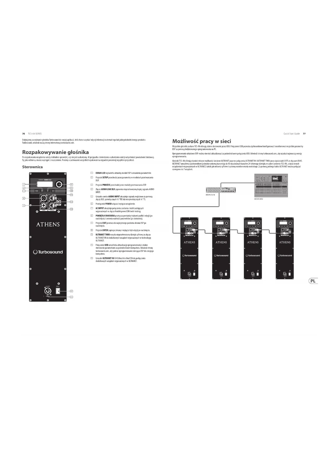 BEFORE AFTER Fig. 1 Fig. 4 Fig. 5 Fig. 6 Fig. 2 Fig. 376 TCS-AN SERIES Quick Start Guide 77 Dziękujemy za wybranie głośnika Turbosound do swojej aplikacji. Jeśli chcesz uzyskać więcej informacji na temat tego lub jakiegokolwiek innego produktu Turbosound, odwiedź naszą stronę internetową turbosound.com. Rozpakowywanie głośnika Po rozpakowaniu urządzenia należy dokładnie sprawdzić, czy nie jest uszkodzony. W przypadku stwierdzenia uszkodzenia należy natychmiast powiadomić dostawcę. Ty, jako odbiorca, musisz wystąpić z roszczeniem. Prosimy o zachowanie wszystkich opakowań na wypadek ponownej wysyłki w przyszłości. Sterownica (1) EKRAN LCD wyświetla aktualny moduł DSP i ustawienia parametrów. (2) Przycisk SETUP przechodzi przez parametry w modułach przetwarzania DSP. (3) Przycisk PROCESS przechodzi przez moduły przetwarzania DSP. (4) Złącze AUDIO LINK XLR zapewnia nieprzetworzoną kopię sygnału AUDIO INPUT. (5) Gniazdo combo AUDIO INPUT akceptuje sygnały wejściowe za pomocą złączy XLR, symetrycznych ¼" TRS lub niesymetrycznych ¼" TS. (6) Przełącznik POWER włącza i wyłącza urządzenie. (7) AC INPUT akceptuje połączenia zasilania z kabli zasilających wyposażonych w złącza Neutrik powerCON twist-locking. (8) POKRĘTŁO ENKODERA przełącza pomiędzy trybami graki i edycji (po naciśnięciu) i zmienia wartości parametrów (po obróceniu). (9) Przycisk EXIT powraca do najwyższego poziomu ekranu DSP po naciśnięciu. (10) Przycisk ENTER zapisuje zmiany i wyłącza tryb edycji po naciśnięciu. (11) ULTRANET THRU wysyła nieprzetworzony dźwięk cyfrowy ze złącza ULTRANET IN do dodatkowych urządzeń wyposażonych w technologię ULTRANET. (12) Połączenie USB umożliwia aktualizację oprogramowania i zdalne sterowanie parametrami za pośrednictwem komputera. Odwiedź stronę turbosound.com, aby pobrać oprogramowanie sterujące DSP dla swojego komputera. (13) Gniazdo ULTRANET IN RJ45/Neutrik etherCON do podłączenia dodatkowych urządzeń wyposażonych w ULTRANET. (6) (7) (9) (10) (11) (13) (8) (1) (2) (3) (4) (5) (12) Możliwość pracy w sieci Wszystkie głośniki zasilane TCS-AN oferują zdalne sterowanie przez USB. Połączenie USB pozwala użytkownikowi kongurować i monitorować wszystkie parametry DSP za pomocą dedykowanego oprogramowania na PC. Oprogramowanie układowe DSP można również aktualizować za pośrednictwem połączenia USB. Odwiedź stronę turbosound.com, aby uzyskać najnowszą wersję oprogramowania. Głośniki TCS-AN oferują również własne możliwości sieciowe ULTRANET poprzez połączenia ULTRANET IN i ULTRANET THRU przy użyciu kabli CAT5 ze złączami RJ45. ULTRANET umożliwia użytkownikowi jednokierunkową transmisję do 16 niezależnych kanałów 24-bitowego dźwięku w całym systemie TCS-AN, a także innych urządzeniach wyposażonych w ULTRANET, takich jak miksery cyfrowe i systemy monitorowania osobistego. Za pomocą jednego kabla ULTRANET można połączyć szeregowo do 7 urządzeń. MIDAS M32MIDAS DL1678 TCS-AN SERIES Quick Start Guide 79 Struktura menu TCS-AN DSP Pełny zasięg Głośnik niskotonowy Funkcjonować PROCES EQ Nic Nic Ustawia pasmo przenoszenia na ustawienie domyślne. Tablica2 – Ustawia skorygowaną charakterystykę częstotliwościową dla 2 szaf ustawionych razem. Tablica3 – Ustawia skorygowaną charakterystykę częstotliwościową dla 3 lub więcej szaf ustawionych razem. Użytkownik Użytkownik Pozwala zdeniować własne ustawienie odpowiedzi częstotliwościowej poprzez wejście do odpowiedniego podmenu. Podmenu Niskie/wysokie półki Niskie/wysokie półki Pozwala zdeniować ltr półkowy o niskiej i wysokiej półce. Parametryczny 1 i 2 Parametryczny 1 i 2 Pozwala zdeniować parametryczny korektor dzwonkowy (częstotliwość, jakość i wzmocnienie). XOVER Nic – Jednostka jest domyślnie ustawiona na odtwarzanie w pełnym zakresie. HP 100 Hz LP 100 Hz Ustawienie wstępne z ltrem 100 Hz, 24 dB/oktawę dla zwrotnicy między subwooferem a głośnikami pełnozakresowymi. HP 120 Hz LP 120 Hz Ustawienie wstępne z ltrem 120 Hz, 24 dB/oktawę dla zwrotnicy między subwooferem a głośnikami pełnozakresowymi. Użytkownik Użytkownik Podmenu zwrotnicy użytkownika do łączenia z innymi systemami głośników pełnozakresowych lub z subwooferem Podmenu Freq Freq Wybierz żądaną częstotliwość podziału: