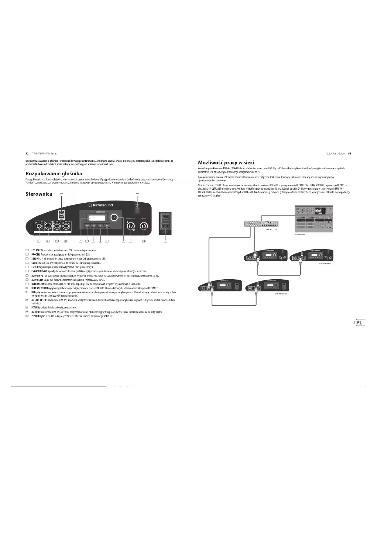 Dröjsmål Justerar mängden fördröjning (max 300 ms = 103,08 m eller 338,19 fot).. Enhet Väljare mellan msek, mätare och fot.. GRÄNSARE Begränsa Justera begränsningströskeln för insignalen (från OFF ner till -30 dB). Denna tröskeljustering låter dig ställa in en maximal uteekt som ligger under högtalarsystemets nominella maxutgång.52 TFM-AN/TFX-AN Series Quick Start Guide 53 Dziękujemy za wybranie głośnika Turbosound do swojego zastosowania. Jeśli chcesz uzyskać więcej informacji na temat tego lub jakiegokolwiek innego produktu Turbosound, odwiedź naszą witrynę internetową pod adresem turbosound.com. Rozpakowanie głośnika Po rozpakowaniu urządzenia należy dokładnie sprawdzić, czy nie jest uszkodzone. W przypadku stwierdzenia uszkodzeń należy natychmiast powiadomić dostawcę. Ty, odbiorca, musisz wszcząć wszelkie roszczenia. Prosimy o zachowanie całego opakowania na wypadek ponownej wysyłki w przyszłości. Sterownica (1) LCD SCREEN wyświetla aktualny moduł DSP i ustawienia parametrów. (2) PROCESS Przycisk przechodzi przez moduły przetwarzania DSP. (3) SETUP Przycisk przechodzi przez parametry w modułach przetwarzania DSP. (4) EXIT Po naciśnięciu przycisk powraca do ekranu DSP najwyższego poziomu. (5) ENTER Przycisk zapisuje zmiany i wyłącza tryb edycji po naciśnięciu. (6) ENCODER KNOB A przełącza pomiędzy trybami graki i edycji (po naciśnięciu) i zmienia wartości parametrów (po obróceniu). (7) AUDIO INPUT Gniazdo combo akceptuje sygnały wejściowe przy użyciu złączy XLR, zbalansowanych ¼ "TRS lub niezbalansowanych ¼" TS. (8) AUDIO LINK Złącze XLR zapewnia nieprzetworzoną kopię sygnału AUDIO INPUT. (9) ULTRANET IN Gniazdo etherCON RJ45 / Neutrik do podłączenia do dodatkowych urządzeń wyposażonych w ULTRANET. (10) ULTRANET THRU wysyła nieprzetworzony dźwięk cyfrowy ze złącza ULTRANET IN do dodatkowych urządzeń wyposażonych w ULTRANET. (11) USB połączenie umożliwia aktualizację oprogramowania i zdalną kontrolę parametrów za pomocą komputera. Odwiedź witrynę turbosound.com, aby pobrać oprogramowanie sterujące DSP na swój komputer. (12) AC LINK OUTPUT (Tylko seria TFM-AN) umożliwia podłączenie zasilania do innych urządzeń za pomocą kabli zasilających ze złączami Neutrik powerCON typu twist-lock. (13) POWER przełącznik włącza i wyłącza urządzenie.. (14) AC INPUT (Tylko seria TFM-AN) akceptuje połączenia zasilania z kabli zasilających wyposażonych w złącza Neutrik powerCON z blokadą skrętną. (15) POWER (Tylko seria TFX-AN) połączenie akceptuje zasilanie z dołączonego kabla IEC. (1) (2) (3) (4) (5) (6)(7) (8) (9) (12) (14) (10) (13)(11) (15) Możliwość pracy w sieci Wszystkie głośniki zasilane TFM-AN / TFX-AN oferują zdalne sterowanie przez USB. Złącze USB umożliwia użytkownikowi kongurację i monitorowanie wszystkich parametrów DSP za pomocą dedykowanego oprogramowania na PC. Oprogramowanie układowe DSP można również aktualizować przez połączenie USB. Odwiedź witrynę turbosound.com, aby uzyskać najnowszą wersję oprogramowaniaukładowego. Głośniki TFM-AN / TFX-AN oferują również opatentowane możliwości sieciowe ULTRANET poprzez połączenia ULTRANET IN i ULTRANET THRU za pomocą kabli CAT5 ze złączami RJ45. ULTRANET umożliwia użytkownikowi jednokierunkową transmisję do 16 niezależnych kanałów 24-bitowego dźwięku w całym systemie TFM-AN / TFX-AN, a także innych urządzeń wyposażonych w ULTRANET, takich jak miksery cyfrowe i systemy monitorów osobistych. Do jednego kabla ULTRANET można podłączyć szeregowo do 7 urządzeń. MIDAS M32 MIDAS DL16 TFM-AN Series TFX-AN Series54 TFM-AN/TFX-AN Series Quick Start Guide 55 Zasilanie sieciowe w sieci Głośniki TFM-AN umożliwiają również sieciową transmisję zasilania sieciowego za pomocą przewodów zasilających z blokowanymi wtykami Neutrik powerCON. Abyustawić sieciowe zasilanie sieciowe między głośnikami TFM-AN, najpierw należy poprowadzić kabel zasilający zakończony złączem powerCON do złącza AC INPUT napanelu tylnym. Aby zasilić dodatkowe głośniki w dół, poprowadź kable zasilające wyposażone w złącza powerCON na obu końcach od wyjścia AC LINK OUTPUT pierwszego głośnika do wejścia AC INPUT następnego głośnika TFM-AN szeregowo. Maksymalna liczba połączonych systemów zależy od napięcia zasilania AC, a także od maksymalnego poboru prądu przez poszczególne systemy w łańcuchu zasilania. Podczas łączenia łańcucha zasilania upewnij się, że zintegrowane złącza, a także dostarczony kabel sieciowy AC nigdy nie są przeciążone. Jeśli nie masz pewności, jak obliczyć całkowity pobór prądu, skontaktuj się ze sprzedawcą. Głośniki TFM-AN zasilane szeregowo Struktura menu TFM-AN / TFX-AN DSP Pełny zasięg Funkcjonować PROCES