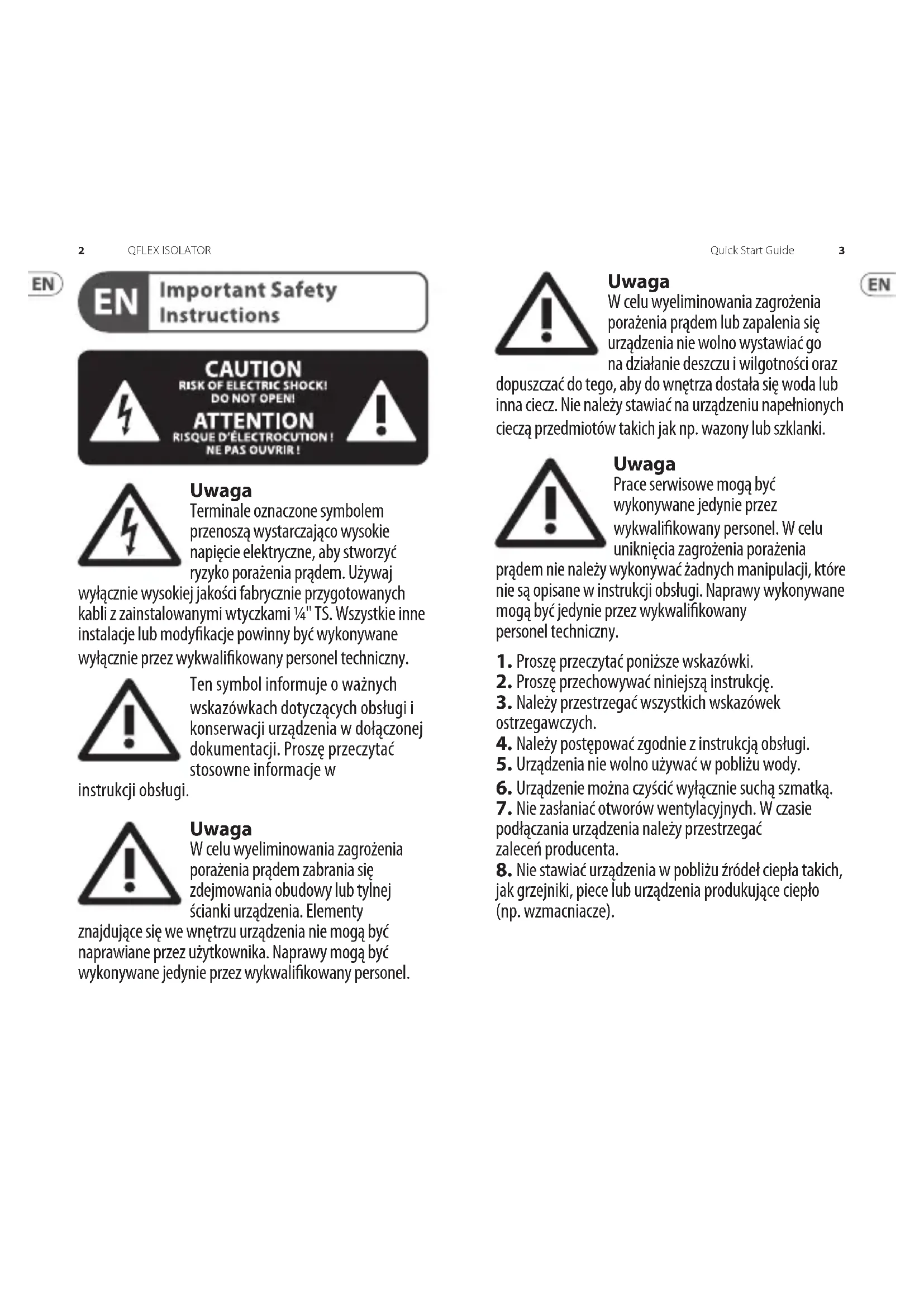 Quick Start Guide QFLEX ISOLATORUwaga W celu wyeliminowania zagrożenia porażenia prądem zabrania się zdejmowania obudowy lub tylnej ścianki urządzenia. Elementy znajdujące się we wnętrzu urządzenia nie mogą być naprawiane przez użytkownika. Naprawy mogą być wykonywane jedynie przez wykwalikowanypersonel. Uwaga W celu wyeliminowania zagrożenia porażenia prądem lub zapalenia się urządzenia nie wolno wystawiać go na działanie deszczu i wilgotności oraz dopuszczać do tego, aby do wnętrza dostała się woda lub inna ciecz. Nie należy stawiać na urządzeniu napełnionych cieczą przedmiotów takich jak np. wazony lub szklanki. Uwaga Prace serwisowe mogą być wykonywane jedynie przez wykwalikowany personel. W celu uniknięcia zagrożenia porażenia prądem nie należy wykonywać żadnych manipulacji, które nie są opisane w instrukcji obsługi. Naprawywykonywane mogą być jedynie przez wykwalikowany personeltechniczny.