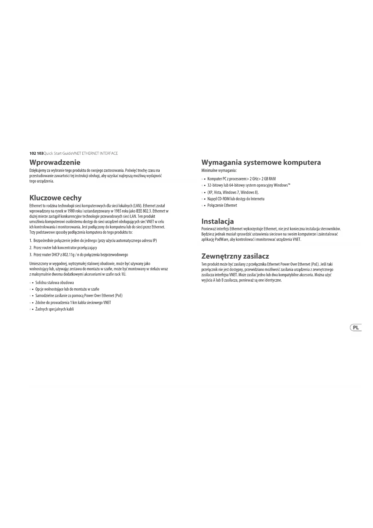 - • Połączenie Ethernet Instalacja Ponieważ interfejs Ethernet wykorzystuje Ethernet, nie jest konieczna instalacja sterowników. Będziesz jednak musiał sprawdzić ustawienia sieciowe na swoim komputerze i zainstalować aplikację PodWare, aby kontrolować i monitorować urządzenia VNET. Zewnętrzny zasilacz Ten produkt może być zasilany z przełącznika Ethernet Power Over Ethernet (PoE). Jeśli taki przełącznik nie jest dostępny, przewidziano możliwość zasilania urządzenia z zewnętrznego zasilacza interfejsu VNET. Może zasilać jedno lub dwa kompatybilne akcesoria. Można użyć wyjścia A lub B zasilacza, ponieważ są one identyczne.104 105Quick Start GuideVNET ETHERNET INTERFACE Podłączanie komputera Komputer można podłączyć do interfejsu Ethernet na dwa sposoby: