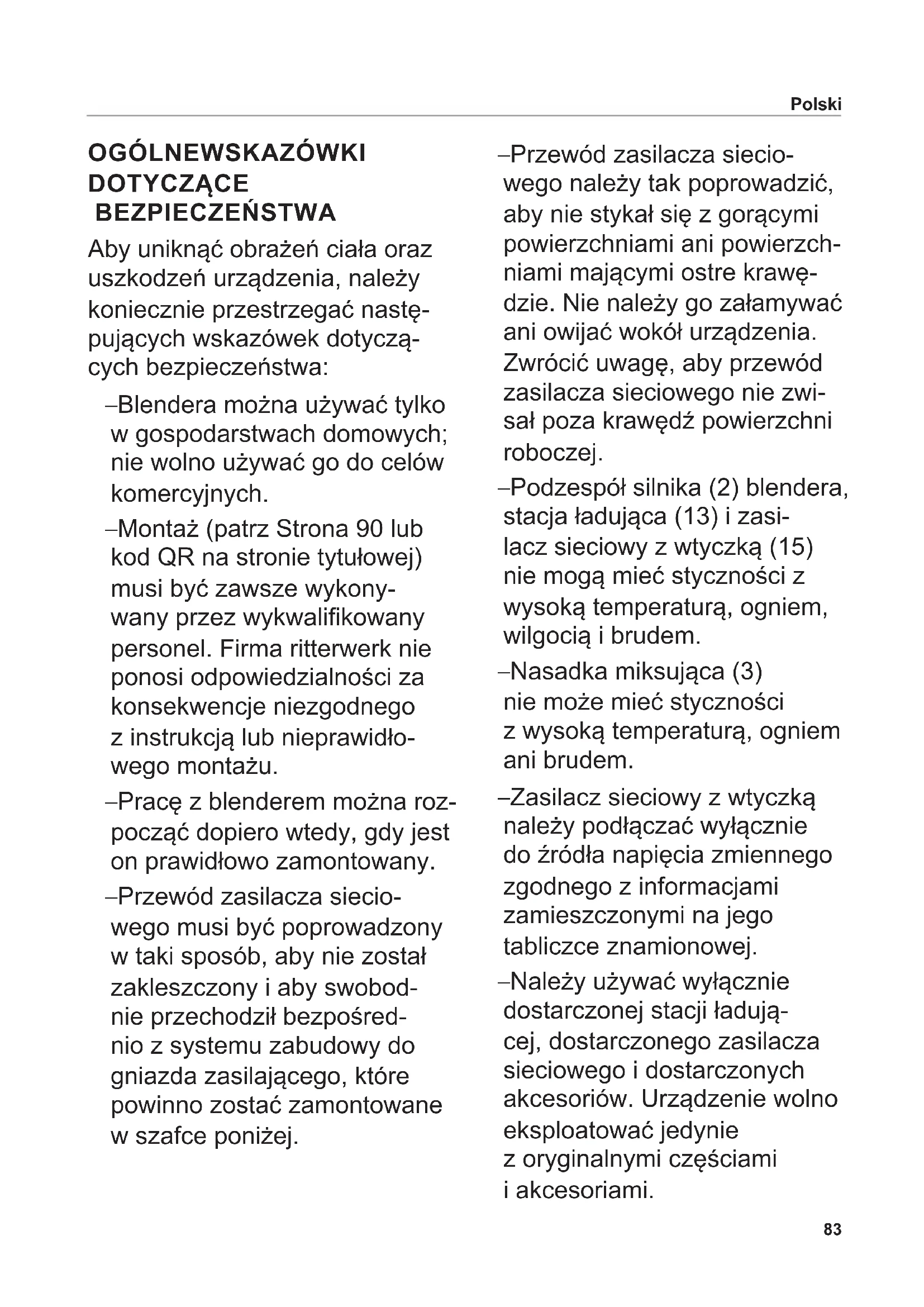 DOTYCZĄCE BEZPIECZEŃSTWA Aby uniknąć obrażeń ciała oraz uszkodzeń urządzenia, należy koniecznie przestrzegać nastę- pujących wskazówek dotyczą- cych bezpieczeństwa: – Blendera można używać tylko w gospodarstwach domowych; nie wolno używać go do celów komercyjnych. – Montaż (patrz Strona 90 lub kod QR na stronie tytułowej) musi być zawsze wykony- wany przez wykwalikowany personel. Firma ritterwerk nie ponosi odpowiedzialności za konsekwencje niezgodnego z instrukcją lub nieprawidło- wego montażu. – Pracę z blenderem można roz- począć dopiero wtedy, gdy jest on prawidłowo zamontowany. – Przewód zasilacza siecio- wego musi być poprowadzony w taki sposób, aby nie został zakleszczony i aby swobod- nie przechodził bezpośred- nio z systemu zabudowy do gniazda zasilającego, które powinno zostać zamontowane w szafce poniżej. – Przewód zasilacza siecio- wego należy tak poprowadzić, aby nie stykał się z gorącymi powierzchniami ani powierzch- niami mającymi ostre krawę- dzie. Nie należy go załamywać ani owijać wokół urządzenia. Zwrócić uwagę, aby przewód zasilacza sieciowego nie zwi- sał poza krawędź powierzchni roboczej. – Podzespół silnika (2) blendera, stacja ładująca (13) i zasi- lacz sieciowy z wtyczką (15) nie mogą mieć styczności z wysoką temperaturą, ogniem, wilgocią i brudem. – Nasadka miksująca (3) nie może mieć styczności z wysoką temperaturą, ogniem ani brudem. – Zasilacz sieciowy z wtyczką należy podłączać wyłącznie do źródła napięcia zmiennego zgodnego z informacjami zamieszczonymi na jego tabliczce znamionowej. – Należy używać wyłącznie dostarczonej stacji ładują- cej, dostarczonego zasilacza sieciowego i dostarczonych akcesoriów. Urządzenie wolno eksploatować jedynie z oryginalnymi częściami i akcesoriami. Polski84 – Ciągłe, jednoczesne miganie wszystkich 4 diod LED ozna- cza poważne uszkodzenie komponentów elektronicz- nych. Może to doprowadzić do zagrożenia przy wymianie końcówek lub akcesoriów i części zamiennych, jak również podczas czyszczenia. Urządzenie należy natych- miast wyłączyć i zlecić jego kontrolę w autoryzowanym punkcie serwisowym. W żad- nym wypadku nie chwytać za końcówkę. Ładowanie akumu- latora w takiej sytuacji nie jest już możliwe. – Urządzenie nie może być używane przez dzieci. Dzieci nie mogą mieć dostępu do urządzenia ani kabla przyłączeniowego. – Urządzenie może być uży- wane przez osoby o ogra- niczonych umiejętnościach zycznych, sensorycznych lub mentalnych bądź osoby z bra- kiem doświadczenia i wiedzy, jeśli mają one zapewniony nadzór lub zostały poinstru- owane w zakresie bezpiecz- nego używania urządzenia i rozumieją zagrożenia zwią- zane z jego używaniem. – Dzieci nie mogą bawić się urządzeniem. – Blendera wolno używać dopiero po włożeniu go do pojemnika z płaskim dnem. – Nie wolno zanurzać blendera w rozdrabniane produkty dalej niż do miejsca połączenia nasadki miksującej z podze- społem silnika. – Nie wolno pozostawiać pra- cującego urządzenia bez nadzoru. – Nie wolno zanurzać całego blendera, stacji ładującej ani zasilacza sieciowego z wtyczką w wodzie lub innych płynach. Nie wolno wysta- wiać urządzenia na deszcz ani w inny sposób narażać go na działanie wilgoci. Jeżeli urządzenie wpadnie do wody, najpierw należy wyciągnąć zasilacz sieciowy z wtyczką z gniazda sieciowego i dopiero potem wyjąć elementy urzą- dzenia z wody. Przed ponow- nym uruchomieniem urzą- dzenia zlecić jego kontrolę w autoryzowanym punkcie serwisowym. – Nie dotykać urządzenia wilgotnymi rękami. Nie uży- wać urządzenia, stojąc na wilgotnym lub mokrym podłożu Polski85 bądź jeżeli urządzenie jest wilgotne albo mokre. Nie uży- wać urządzenia na zewnątrz pomieszczeń. – Nie wolno myć blendera i stacji ładującej w zmywarce do naczyń. – W trakcie pracy blendera nie wolno pod żadnym pozo- rem dotykać końcówek ani wkładać w blender żadnych przedmiotów. Niebezpieczeństwo obrażeń – W przypadku zakłóceń w pracy stacji ładującej zawsze trzeba wyciągnąć zasilacz sieciowy z wtyczką z gniazda sieciowego. Należy ciągnąć za wtyczkę, nie za przewód. – Aby uniknąć zagrożeń w przy- padku stwierdzenia uszkodzeń elementów urządzenia, należy je natychmiast wyłączyć. Przed ponownym uruchomie- niem urządzenia zlecić jego kontrolę w autoryzowanym punkcie serwisowym. – Jeżeli zasilacz sieciowy z wtyczką albo jego prze- wód zostaną uszkodzone, konieczna jest wymiana na nowy zasilacz sieciowy z wtyczką, dostępny u produ- Polski centa albo w jego krajowym dziale obsługi klienta. – Przy czyszczeniu blendera, zdejmowaniu albo nakłada- niu końcówek oraz wymianie akcesoriów i części zapaso- wych pod żadnym warun- kiem nie wolno go włączać. Trzymać palce z daleka od przycisków. Nie dotykać ostrzy końcówek, ponieważ są bar- dzo ostre. – Produkty spożywcze mogą w trakcie ich przetwarzania pryskać. W związku z tym w celu uniknięcia oparzeń gorące produkty należy przed obróbką schłodzić. – Jeżeli blender ma zostać użyty w garnku, należy zdjąć garnek z ognia. – Należy dbać o to, aby wycię- cie w końcówce dokładnie przylegało do trzpienia na wale napędowym. Nie wolno używać luźnych, nieprzylega- jących dobrze końcówek — należy zastąpić je nowymi. Zagrożenie wybuchem – Chronić akumulatory przed wysoką temperaturą i ogniem.86 Rozłożyć ilustracje znajdujące się za przednią oraz tylną okładką instrukcji. Przed uruchomieniem urządze- nia należy dokładnie przeczytać instrukcję obsługi. Zachować instrukcję obsługi i w przypadku przekazania urządzenia następ- nemu użytkownikowi przekazać ją wraz z urządzeniem. Alternatywnie można również skorzystać z aktualnej instrukcji obsługi dostępnej na stronie www.ritterwerk.de
