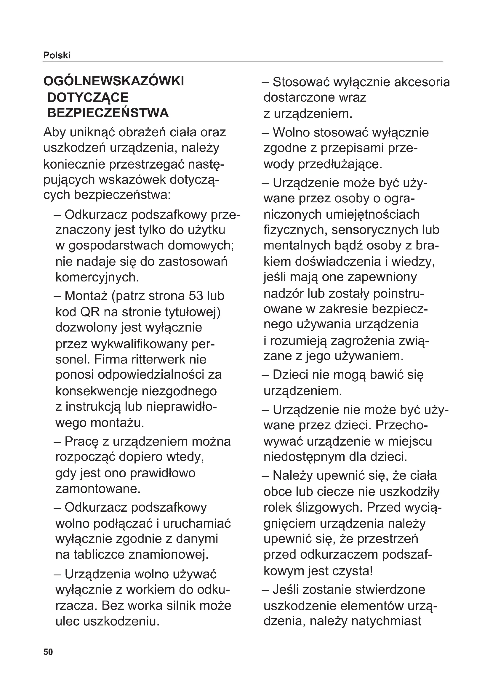 DOTYCZĄCE BEZPIECZEŃSTWA Aby uniknąć obrażeń ciała oraz uszkodzeń urządzenia, należy koniecznie przestrzegać nastę- pujących wskazówek dotyczą- cych bezpieczeństwa: – Odkurzacz podszafkowy prze- znaczony jest tylko do użytku w gospodarstwach domowych; nie nadaje się do zastosowań komercyjnych. – Montaż (patrz strona 53 lub kod QR na stronie tytułowej) dozwolony jest wyłącznie przez wykwalikowany per- sonel. Firma ritterwerk nie ponosi odpowiedzialności za konsekwencje niezgodnego z instrukcją lub nieprawidło- wego montażu. – Pracę z urządzeniem można rozpocząć dopiero wtedy, gdy jest ono prawidłowo zamontowane. – Odkurzacz podszafkowy wolno podłączać i uruchamiać wyłącznie zgodnie z danymi na tabliczce znamionowej. – Urządzenia wolno używać wyłącznie z workiem do odku- rzacza. Bez worka silnik może ulec uszkodzeniu. – Stosować wyłącznie akcesoria dostarczone wraz z urządzeniem. – Wolno stosować wyłącznie zgodne z przepisami prze- wody przedłużające. – Urządzenie może być uży- wane przez osoby o ogra- niczonych umiejętnościach zycznych, sensorycznych lub mentalnych bądź osoby z bra- kiem doświadczenia i wiedzy, jeśli mają one zapewniony nadzór lub zostały poinstru- owane w zakresie bezpiecz- nego używania urządzenia i rozumieją zagrożenia zwią- zane z jego używaniem. – Dzieci nie mogą bawić się urządzeniem. – Urządzenie nie może być uży- wane przez dzieci. Przecho- wywać urządzenie w miejscu niedostępnym dla dzieci. – Należy upewnić się, że ciała obce lub ciecze nie uszkodziły rolek ślizgowych. Przed wycią- gnięciem urządzenia należy upewnić się, że przestrzeń przed odkurzaczem podszaf- kowym jest czysta! – Jeśli zostanie stwierdzone uszkodzenie elementów urzą- dzenia, należy natychmiast51 Polski wyłączyć urządzenie i skontak- tować się z punktem obsługi klienta rmy ritter. – Jeśli podczas użytkowania pojawią się dziwne odgłosy, zapachy, dym lub inne błędy, w miarę możliwości należy wyciągnąć wtyczkę lub wyłą- czyć bezpiecznik główny. – Nie należy naprawiać urządze- nia samodzielnie. Przerwanie plomby na obudowie silnika powoduje nieodwołalne wyga- śnięcie gwarancji! Niebezpieczeństwo obrażeń – Nigdy nie używać wysuniętego urządzenia jako pomocy do wspinania się. – Niebezpieczeństwo potknięcia przy wysuniętym urządzeniu! – Nigdy nie otwierać komory silnika, gdy silnik pracuje.52 Polski Przed uruchomieniem urządze- nia należy dokładnie przeczytać instrukcję obsługi. Zachować instrukcję obsługi i w przypadku przekazania urządzenia następ- nemu użytkownikowi przekazać ją wraz z urządzeniem. Alternatywnie można również skorzystać z aktualnej instrukcji obsługi, dostępnej na stronie www.ritterwerk.de. PRZEZNACZENIE Odkurzacz podszafkowy służy do szybkiego usuwania okruchów i kurzu w kuchni. Użycie niezgodne z przeznacze- niem lub niewłaściwa obsługa mogą doprowadzić do poważ- nych obrażeń lub uszkodzenia urządzenia. W konsekwencji wygasają wszelkie prawa z tytułu gwarancji i rękojmi. ODKURZANIE