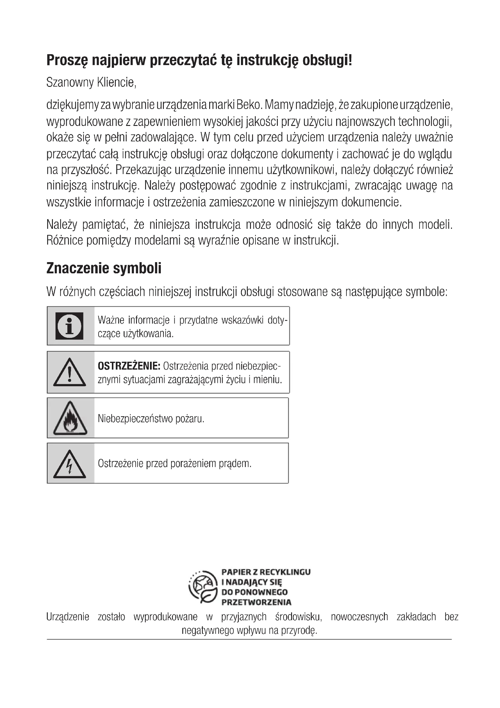 - Produkty firmy Beko spełniają wszystkie wymogi stosownych norm bezpieczeństwa. W przypa- dku jakiegokolwiek uszkodzenia urządzenia lub przewodu zasi- lającego, aby uniknąć wszelkich zagrożeń, należy oddać je do naprawy lub wymiany przez spr- zedawcę, punkt serwisowy lub specjalistę albo autoryzowany serwis. Błędna lub niefachowa naprawa może być niebe- zpieczna i powodować zagroże- nie dla użytkowników.