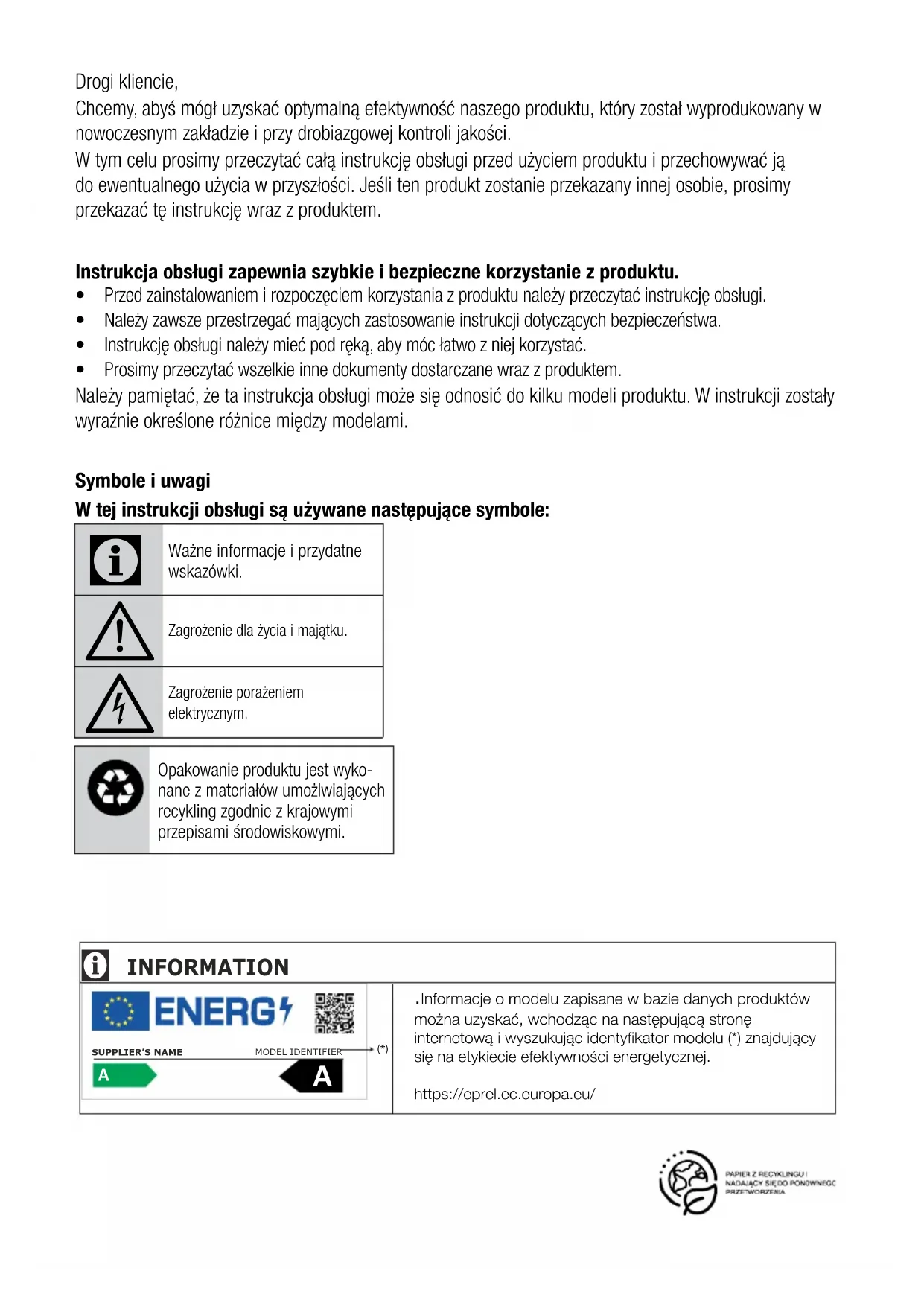 Ważne informacje i przydatne wskazówki. Zagrożenie dla życia i majątku. Zagrożenie porażeniem elektrycznym.Opakowanie produktu jest wyko-nane z materiałów umożlwiających recykling zgodnie z krajowymi przepisami środowiskowymi. .Informacje o modelu zapisane w bazie danych produktów można uzyskać, wchodząc na następującą stronę internetową i wyszukując identyfikator modelu (*) znajdujący się na etykiecie efektywności energetycznej.https://eprel.ec.europa.eu/