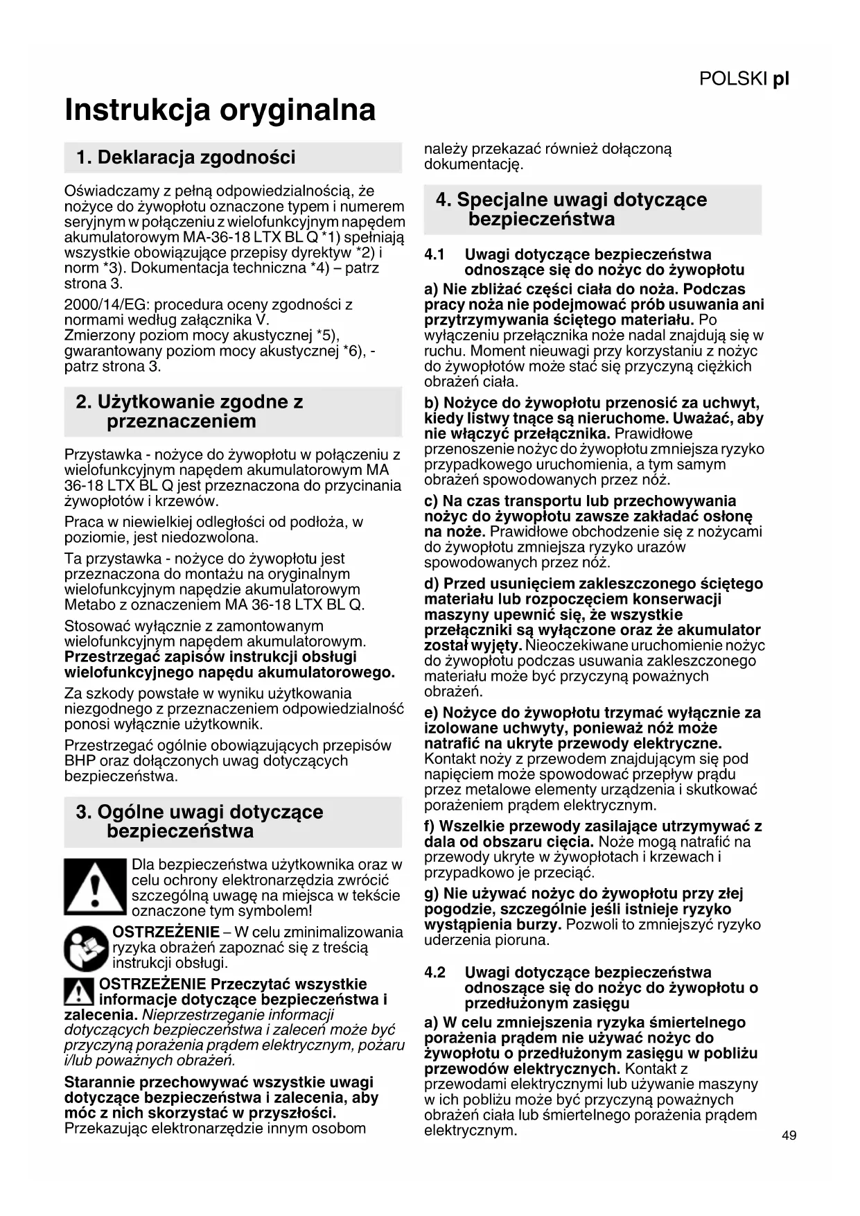 Instrukcja oryginalna Oświadczamy z pełną odpowiedzialnością, że nożyce do żywopłotu oznaczone typem i numerem seryjnym w połączeniu z wielofunkcyjnym napędem akumulatorowym MA-36-18 LTX BL Q *1) spełniają wszystkie obowiązujące przepisy dyrektyw *2) i norm *3). Dokumentacja techniczna *4) – patrz strona 3. 2000/14/EG: procedura oceny zgodności z normami według załącznika V. Zmierzony poziom mocy akustycznej *5), gwarantowany poziom mocy akustycznej *6), - patrz strona 3. Przystawka - nożyce do żywopłotu w połączeniu z wielofunkcyjnym napędem akumulatorowym MA 36-18 LTX BL Q jest przeznaczona do przycinania żywopłotów i krzewów. Praca w niewielkiej odległości od podłoża, w poziomie, jest niedozwolona. Ta przystawka - nożyce do żywopłotu jest przeznaczona do montażu na oryginalnym wielofunkcyjnym napędzie akumulatorowym Metabo z oznaczeniem MA 36-18 LTX BL Q. Stosować wyłącznie z zamontowanym wielofunkcyjnym napędem akumulatorowym. Przestrzegać zapisów instrukcji obsługi wielofunkcyjnego nap ędu akumulatorowego. Za szkody powstałe w wyniku użytkowania niezgodnego z przeznaczeniem odpowiedzialność ponosi wyłącznie użytkownik. Przestrzegać ogólnie obowiązujących przepisów BHP oraz dołączonych uwag dotyczących bezpieczeństwa. Dla bezpieczeństwa użytkownika oraz w celu ochrony elektronarzędzia zwrócić szczególną uwagę na miejsca w tekście oznaczone tym symbolem! OSTRZEŻENIE – W celu zminimalizowania ryzyka obrażeń zapoznać się z treścią instrukcji obsługi. OSTRZEŻENIE Przeczytać wszystkie informacje dotyczące bezpieczeństwa i zalecenia. Nieprzestrzeganie informacji dotyczących bezpieczeństwa i zaleceń może być przyczyną porażenia prądem elektrycznym, pożaru i/lub poważnych obrażeń. Starannie przechowywać wszystkie uwagi dotyczące bezpieczeństwa i zalecenia, aby móc z nich skorzystać w przyszłości. Przekazując elektronarzędzie innym osobom należy przekazać również dołączoną dokumentację.