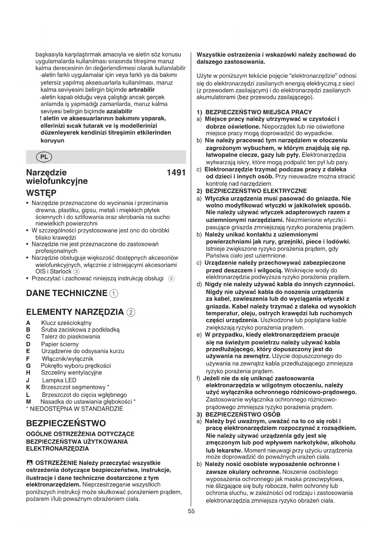 düğmesini “I”/”O” konumuna getirerek açıp çalıştırın/kapatın ! aksesuar iş parçasına temas etmeden önce en yüksek devir sayısına ulaşılmalıdır ! aleti kapatmadan önce iş parçası üzerinden kaldırın55 Wszystkie ostrzeżenia i wskazówki należy zachować do dalszego zastosowania. Użyte w poniższym tekście pojęcie “elektronarzędzie” odnosi się do elektronarzędzi zasilanych energią elektryczną z sieci (z przewodem zasilającym) i do elektronarzędzi zasilanych akumulatorami (bez przewodu zasilającego).
