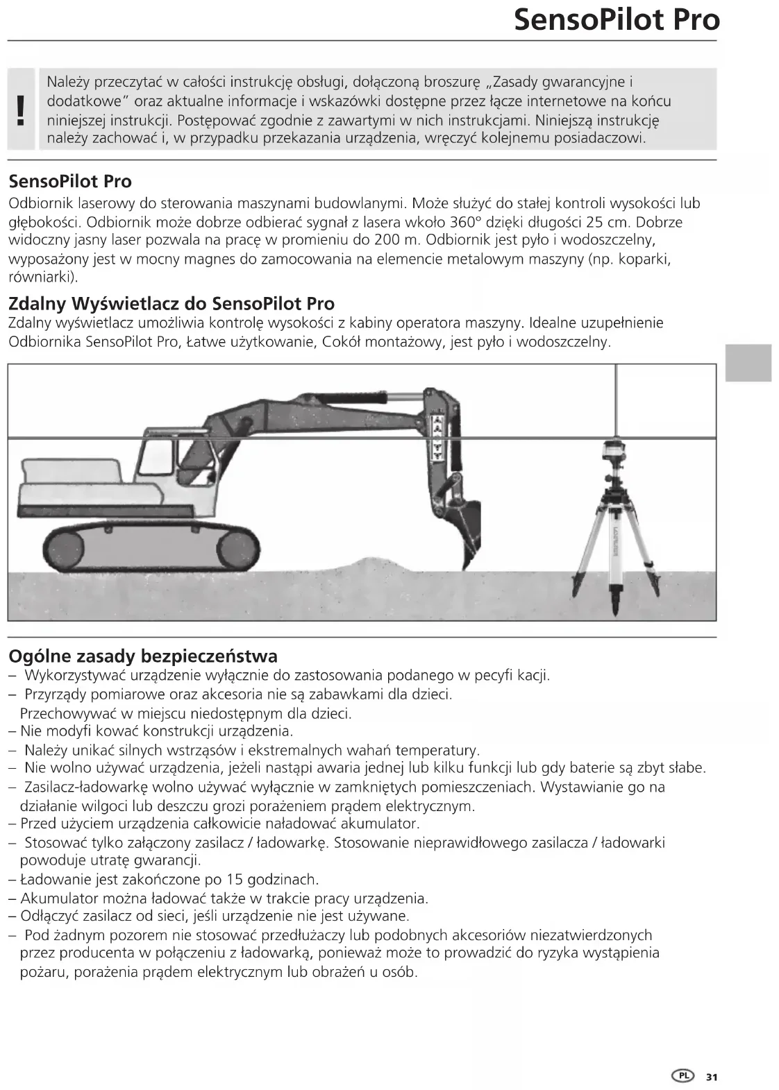 Norme UE e smaltimento L‘apparecchio soddisfa tutte le norme necessarie per la libera circolazione di merci all‘interno dell‘UE. Questo prodotto è un apparecchio elettrico e deve pertanto essere raccolto e smaltito separatamente in conformità con la direttiva europea sulle apparecchiature elettriche ed elettroniche usate. Per ulteriori informazioni ed indicazioni di sicurezza: http://laserliner.com/info?an=sesopipr Anleitung_SensoPilot_Rev18W16.indd 30 20.04.18 07:36SensoPilot Pro Odbiornik laserowy do sterowania maszynami budowlanymi. Może służyć do stałej kontroli wysokości lub głębokości. Odbiornik może dobrze odbierać sygnał z lasera wkoło 360° dzięki długości 25 cm. Dobrze widoczny jasny laser pozwala na pracę w promieniu do 200 m. Odbiornik jest pyło i wodoszczelny, wyposażony jest w mocny magnes do zamocowania na elemencie metalowym maszyny (np. koparki, równiarki). Zdalny Wyświetlacz do SensoPilot Pro Zdalny wyświetlacz umożliwia kontrolę wysokości z kabiny operatora maszyny. Idealne uzupełnienie Odbiornika SensoPilot Pro, Łatwe użytkowanie, Cokół montażowy, jest pyło i wodoszczelny. SensoPilot Pro