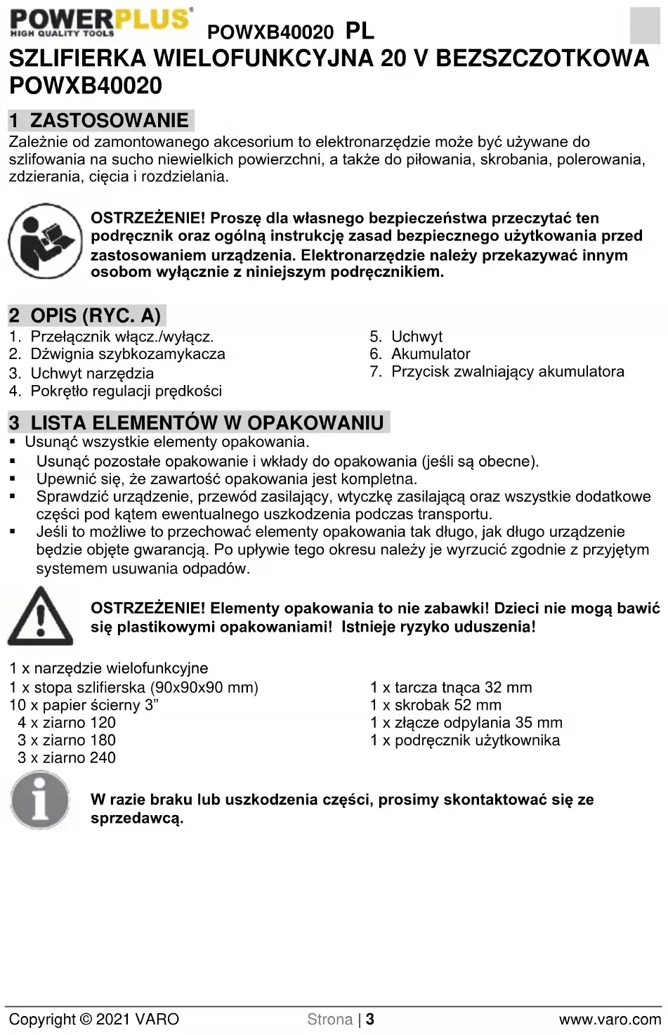 - Szczególną ostrożność należy zachować przy operacji wrzynania w ściany lub inne obszary o ograniczonej widoczności. Po przejściu przez materiał tarcza może natrafić na obiekty powodujące jej „odbicie”.POWXB40020 PL Copyright © 2021 VARO Strona | 8 www.varo.com 7 DODATKOWE ZALECENIA DOTYCZĄCE BEZPIECZEŃSTWA DLA