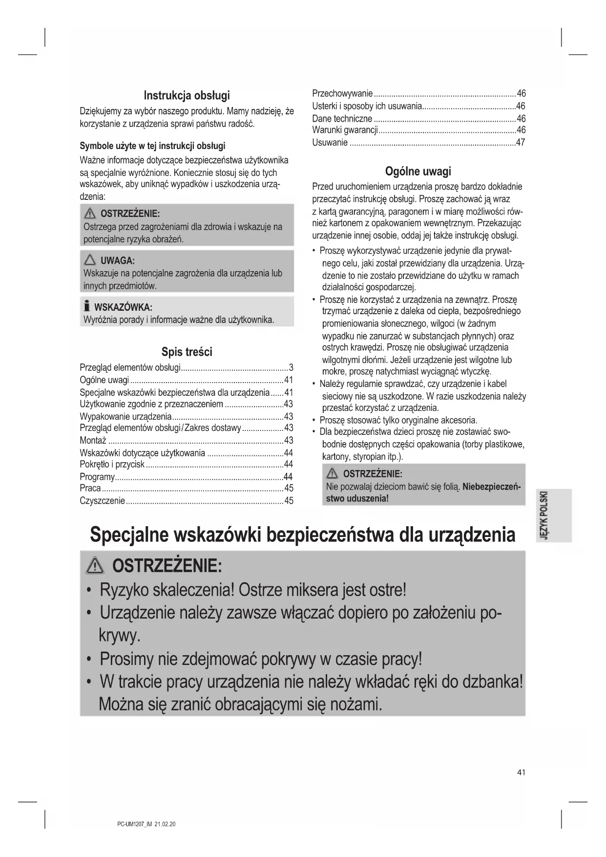 - W trakcie pracy urządzenia nie należy wkładać ręki do dzbanka! Można się zranić obracającymi się nożami.PC-UM1207_IM 21.02.20