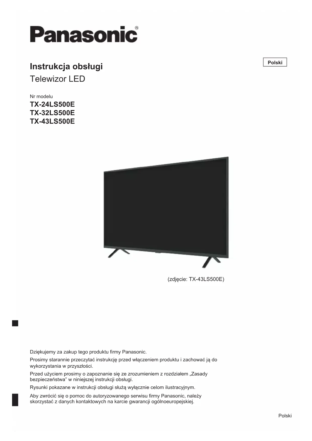 Отпечатано в КитайNr modelu TX-24LS500E TX-32LS500E TX-43LS500E Instrukcja obsługi Telewizor LED Polski Dziękujemy za zakup tego produktu firmy Panasonic. Prosimy starannie przeczytać instrukcję przed włączeniem produktu i zachować ją do wykorzystania w przyszłości. Przed użyciem prosimy o zapoznanie się ze zrozumieniem z rozdziałem „Zasady bezpieczeństwa” w niniejszej instrukcji obsługi. Rysunki pokazane w instrukcji obsługi służą wyłącznie celom ilustracyjnym. Aby zwrócić się o pomoc do autoryzowanego serwisu firmy Panasonic, należy skorzystać z danych kontaktowych na karcie gwarancji ogólnoeuropejskiej. (zdjęcie: TX-43LS500E) PolskiPolski