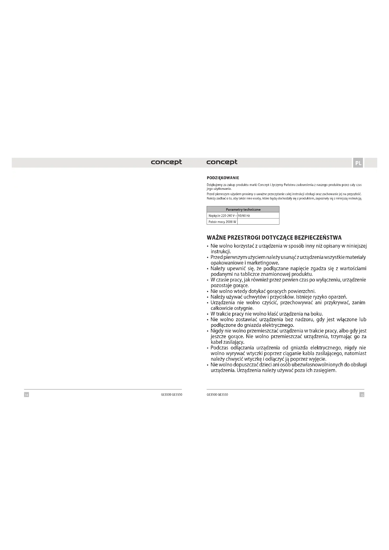 GE3500 GE3550 PODZIĘKOWANIE Dziękujemy za zakup produktu marki Concept i życzymy Państwu zadowolenia z naszego produktu przez cały czas jego użytkowania. Przed pierwszym użyciem prosimy o uważne przeczytanie całej instrukcji obsługi oraz zachowanie jej na przyszłość. Należy zadbać o to, aby także inne osoby, które będą obchodziły się z produktem, zapoznały się z niniejszą instrukcją. Parametry techniczne Napięcie 220-240 V ~ 50/60 Hz Pobór mocy 2000 W WAŻNE PRZESTROGI DOTYCZĄCE BEZPIECZEŃSTWA