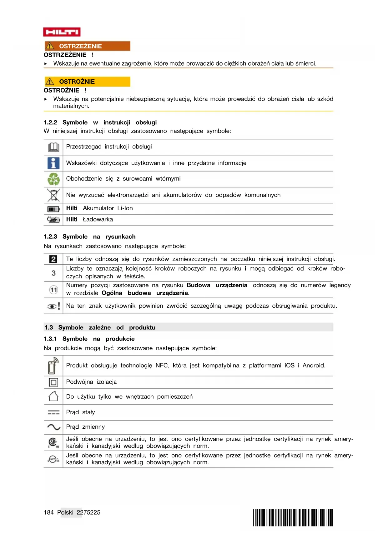 W niniejszej instrukcji obsługi zastosowano następujące symbole: Przestrzegać instrukcji obsługi Wskazówki dotyczące użytkowania i inne przydatne informacje Obchodzenie się z surowcami wtórnymi Nie wyrzucać elektronarzędzi ani akumulatorów do odpadów komunalnych Hilti Akumulator LiIon Hilti Ładowarka
