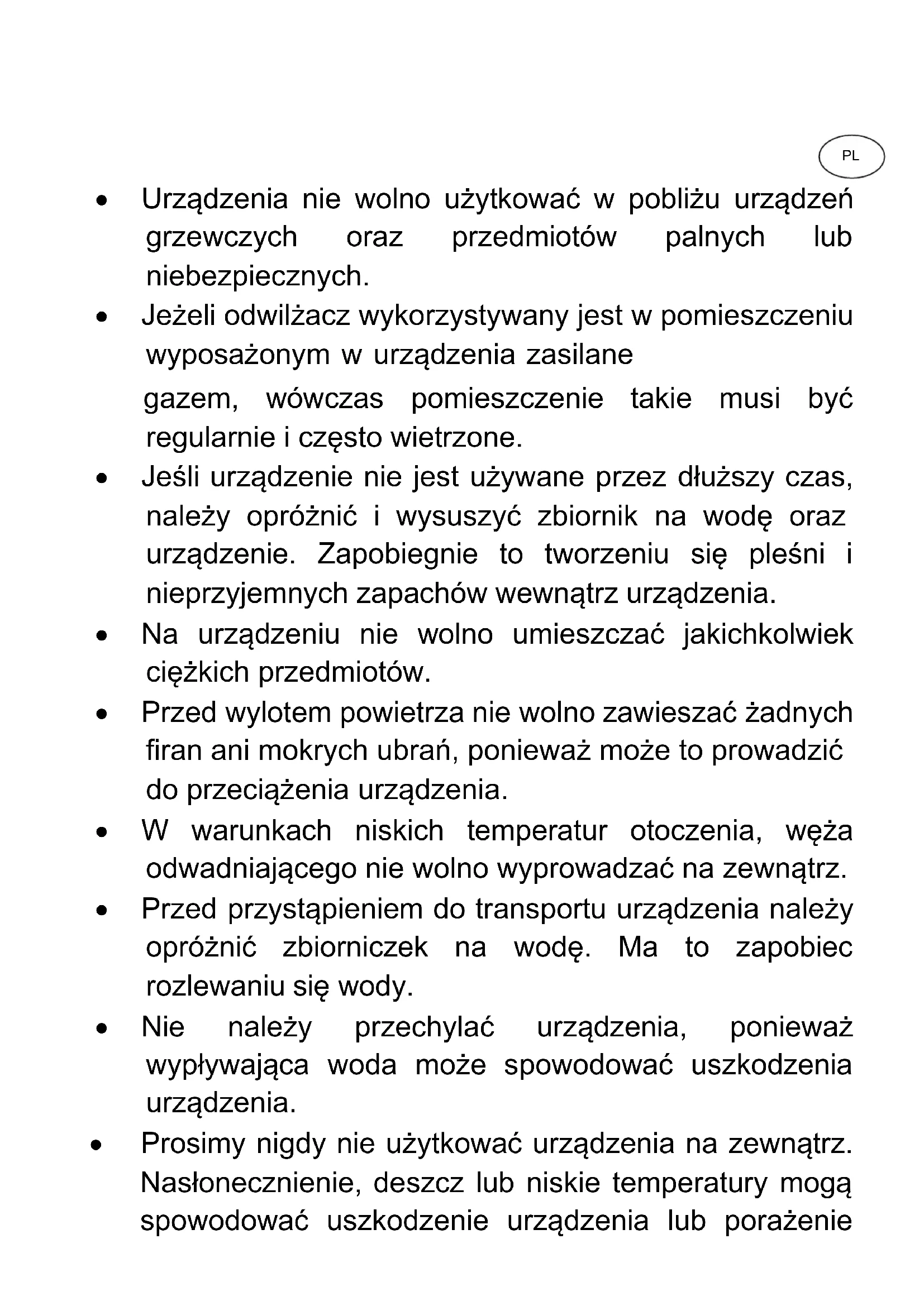 - Jeżeli odwilżacz wykorzystywany jest w pomieszczeniu wyposażonym w urządzenia zasilane gazem, wówczas pomieszczenie takie musi być regularnie i często wietrzone.