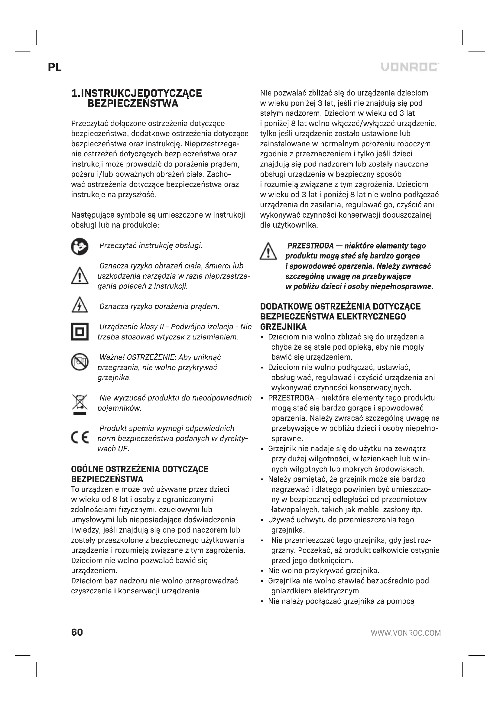 Problem Możliwa przyczyna Rozwiązanie Urządzenie nie nagrzewało, tylko wentylator działał Przełącznik nie został ustawiony wpołożeniu ogrzewania Ustaw przełącznik wpołożeniu ogrzewania Termostat nie działa Przekręcić termostat iposłuchać, czy słychać dźwięk otwierania/ zamykania. Jeśli nie słychać kliknięcia itermostat nie jest uszkodzony, grzejnik włączy się automatycznie po ochłodzeniu urządzenia. Samoczynnie resetujący się wyłącznik nie działa Wyłączyć grzejnik isprawdzić, czy wlot lub wylot nie jest zablokowany. Wyciągnąć wtyczkę iprzed próbą ponownego uruchomienia grzejnika odczekać co najmniej 10minut, aż zresetuje się system zabezpieczający. Nietypowy hałas Urządzenie nie stoi wpozycji pionowej. Ustawić grzejnik na poziomej powierzchni. OCHRONA ŚRODOWISKA Uszkodzone i/lub niepotrzebne urządzenia elektryczne lub elektroniczne podlegają zbiórce wodpowiednich punktach recyklingu. Tylko kraje WE Nie wyrzucać elektronarzędzi wraz zodpadami zgospodarstw domowych. Zgodnie zdyrektywą 2012/19/UE dotyczącą zużytych urządzeń elek- trycznych ielektronicznych oraz jej wdrożeniem do prawodawstwa krajowego, elektronarzędzia, które już nie nadają się do użytku, podlegają oddziel- nej zbiórce oraz utylizacji wsposób przyjazny dla środowiska. GWARANCJA Produkty VONROC są wytwarzane zgodnie znajwyż- szymi standardami jakości iproducent udziela gwarancji na wady materiałowe iwady wykonania na okres wymagany prawem, licząc od dnia zaku- pu. Jeśli wystąpi usterka produktu wtym okresie spowodowana wadą materiałową i/lub wadą wykonania, proszę bezpośrednio skontaktować się ze sprzedawcą VONROC. Następujące okoliczności powodują unieważnienie gwarancji: