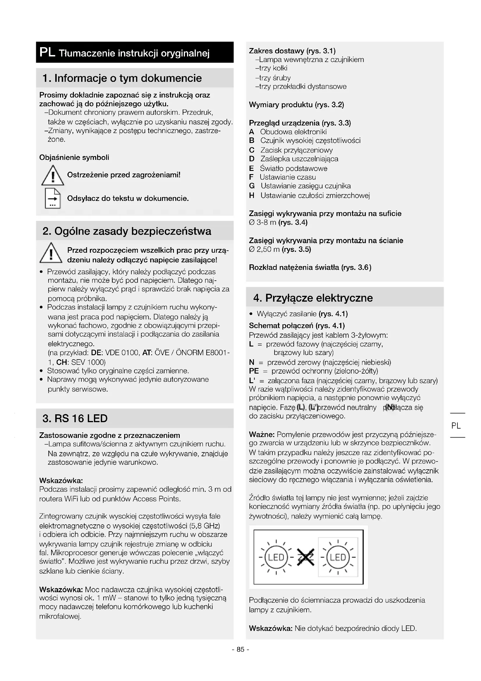 Zakres dostawy (rys. 3.1) – Lampa wewnętrzna z czujnikiem – trzy kołki – trzy śruby – trzy przekładki dystansowe Wymiary produktu (rys.3.2) Przegląd urządzenia (rys. 3.3) A Obudowa elektroniki B Czujnik wysokiej częstotliwości C Zacisk przyłączeniowy D Zaślepka uszczelniająca E Światło podstawowe F Ustawianie czasu G Ustawianie zasięgu czujnika H Ustawianie czułości zmierzchowej Zasięgi wykrywania przy montażu na suficie Ø 3-8m (rys. 3.4) Zasięgi wykrywania przy montażu na ścianie Ø 2,50 m (rys. 3.5) Rozkład natężenia światła (rys.3.6 )