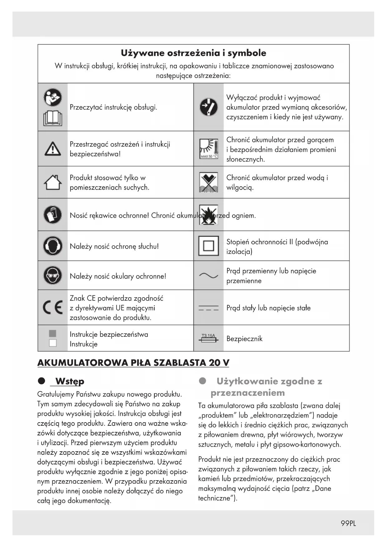 Wstęp Gratulujemy Państwu zakupu nowego produktu. Tym samym zdecydowali się Państwo na zakup produktu wysokiej jakości. Instrukcja obsługi jest częścią tego produktu. Zawiera ona ważne wska- zówki dotyczące bezpieczeństwa, użytkowania i utylizacji. Przed pierwszym użyciem produktu należy zapoznać się ze wszystkimi wskazówkami dotyczącymi obsługi i bezpieczeństwa. Używać produktu wyłącznie zgodnie z jego poniżej opisa- nym przeznaczeniem. W przypadku przekazania produktu innej osobie należy dołączyć do niego całą jego dokumentację. Użytkowanie zgodne z przeznaczeniem Ta akumulatorowa piła szablasta (zwana dalej „produktem” lub „elektronarzędziem”) nadaje się do lekkich i średnio ciężkich prac, związanych z piłowaniem drewna, płyt wiórowych, tworzyw sztucznych, metalu i płyt gipsowo-kartonowych. Produkt nie jest przeznaczony do ciężkich prac związanych z piłowaniem takich rzeczy, jak kamień lub przedmiotów, przekraczających maksymalną wydajność cięcia (patrz „Dane techniczne”).100