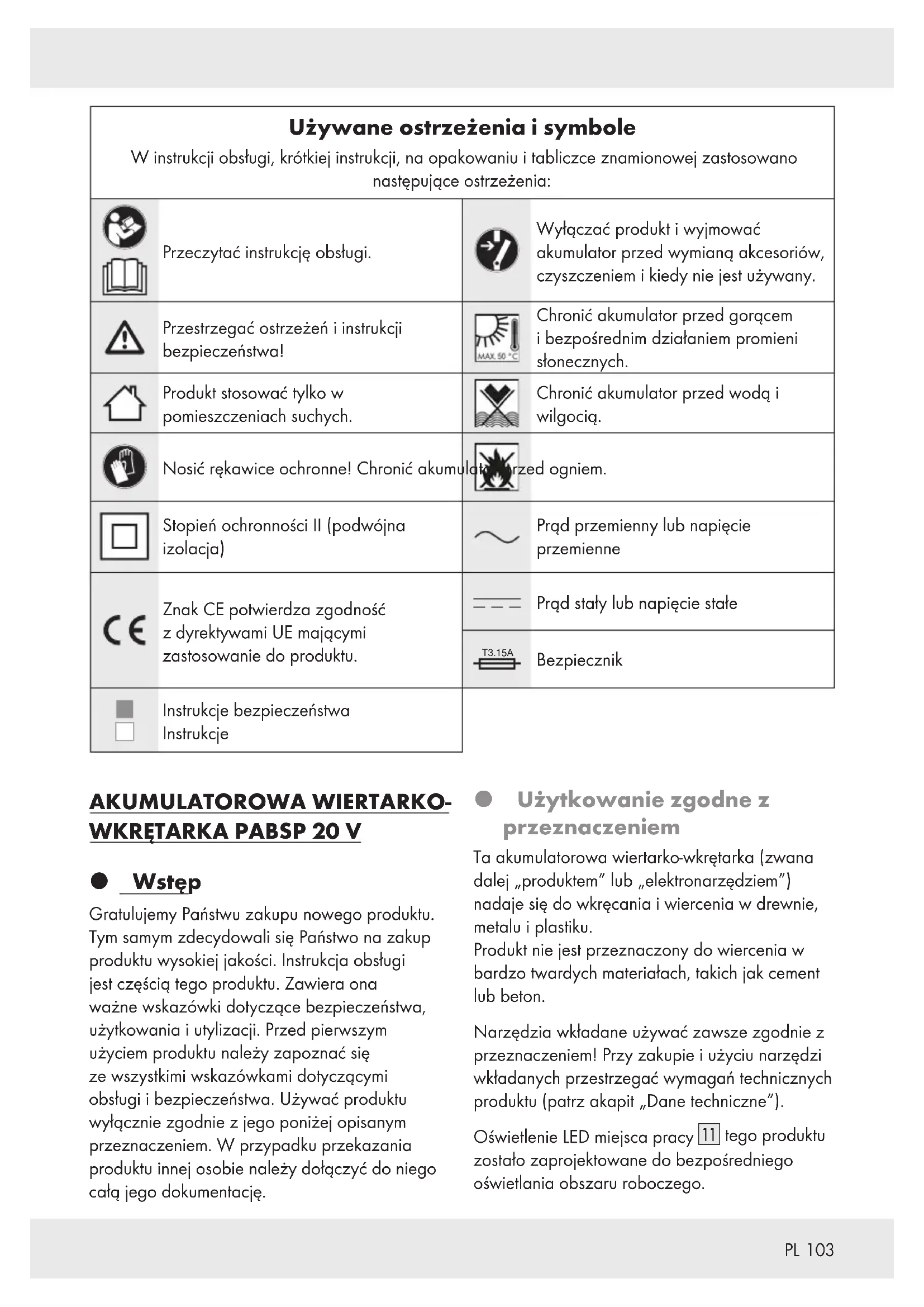 Używane ostrzeżenia i symbole W instrukcji obsługi, krótkiej instrukcji, na opakowaniu i tabliczce znamionowej zastosowano następujące ostrzeżenia: Przeczytać instrukcję obsługi. Wyłączać produkt i wyjmować akumulator przed wymianą akcesoriów, czyszczeniem i kiedy nie jest używany. Przestrzegać ostrzeżeń i instrukcji bezpieczeństwa! Chronić akumulator przed gorącem i bezpośrednim działaniem promieni słonecznych. Produkt stosować tylko w pomieszczeniach suchych. Chronić akumulator przed wodą i wilgocią. Nosić rękawice ochronne! Chronić akumulator przed ogniem. Stopień ochronności II (podwójna izolacja) Prąd przemienny lub napięcie przemienne Znak CE potwierdza zgodność z dyrektywami UE mającymi zastosowanie do produktu. Prąd stały lub napięcie stałe T3.15A Bezpiecznik Instrukcje bezpieczeństwa Instrukcje AKUMULATOROWA WIERTARKO-